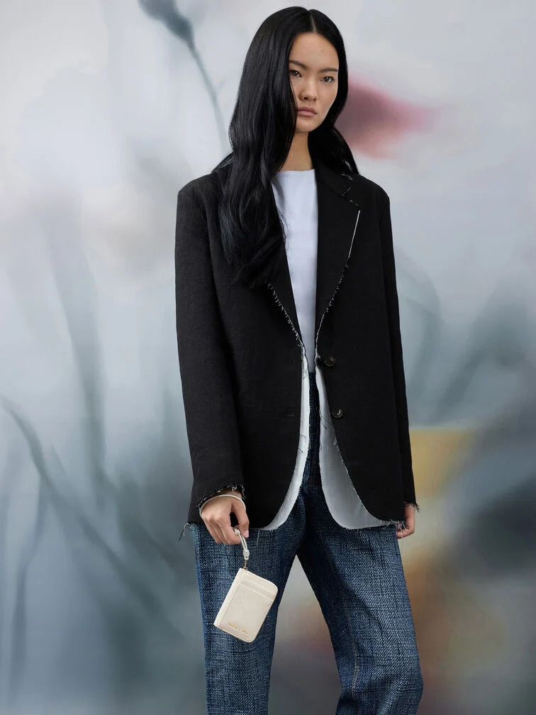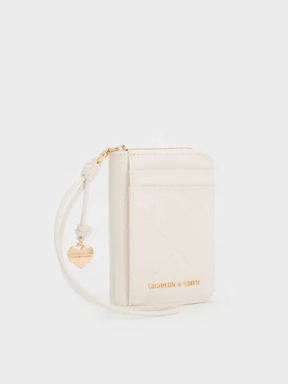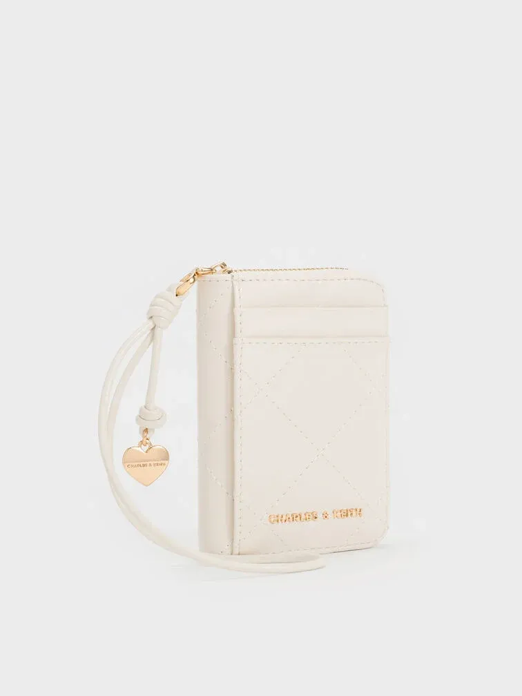 This Apfra wristlet in cream features a quilted design, a heart charm and a detachable knotted strap. Featuring multiple card slots, as well as an internal gusseted section for note bills and coins, this slim wristlet is ideal for quick errand runs and lunch breaks.
