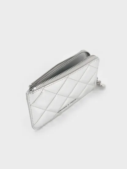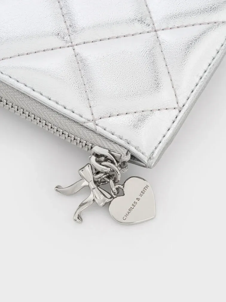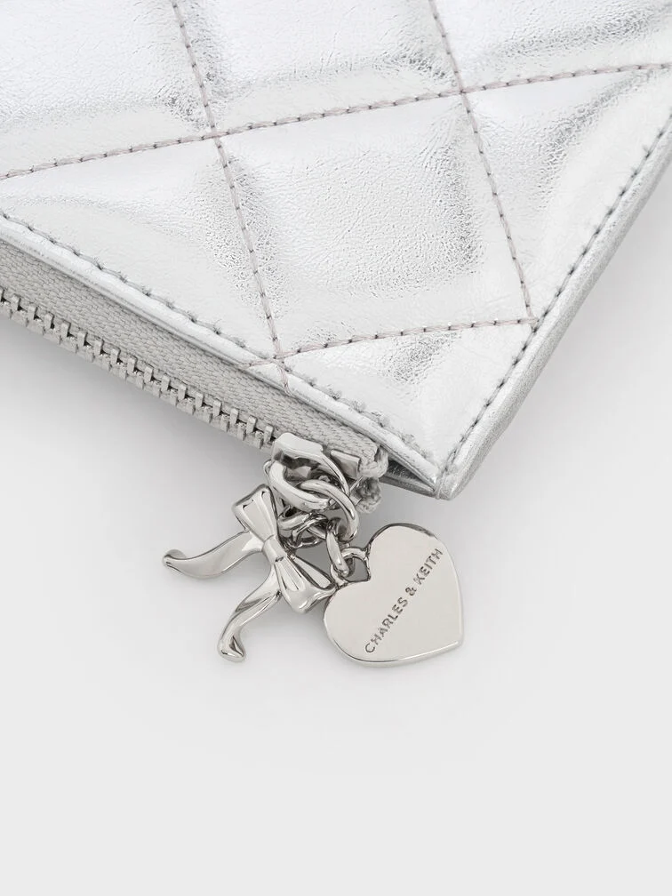 This Arrietty wallet in silver feature a quilted finish and a secure zip-around closure, as well as charming bow and heart charms. Its striking metallic finish makes it easy to find even in the depths of your bag.