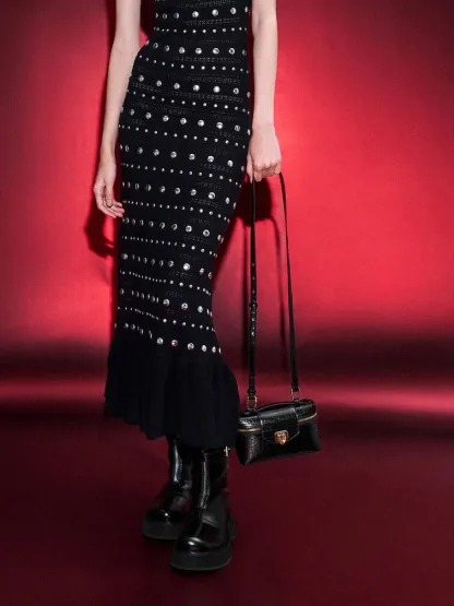 Vanity bags continue to dominate as one of the must-have accessories this season, and this all-black croc-effect iteration will complement any outfit. Featuring a top-handle silhouette and a front flap push-lock closure, it evokes the charm of vintage vanity cases with its elegant rectangular shape. In terms of functionality, it provides easy access to your essentials while keeping them secure. For versatility, you can either carry it by hand via the top handle or clip on the shoulder strap for a hands-free option.