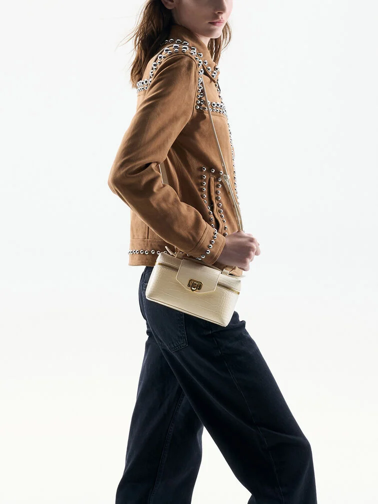 From daytime events to evening dinners, this Arwen vanity bag in cream will see you through every occasion on your calendar. Featuring a top-handle silhouette and a front flap push-lock closure, it evokes the charm of vintage vanity cases with its elegant rectangular shape. Its elongated and compact design offers just enough space for your daily and beauty essentials. Carry this bag in multiple ways: as a top handle or a crossbody bag with the detachable shoulder strap.