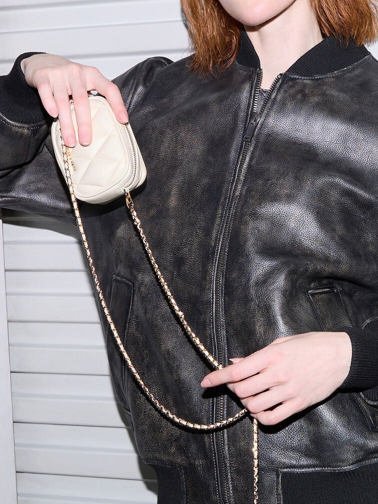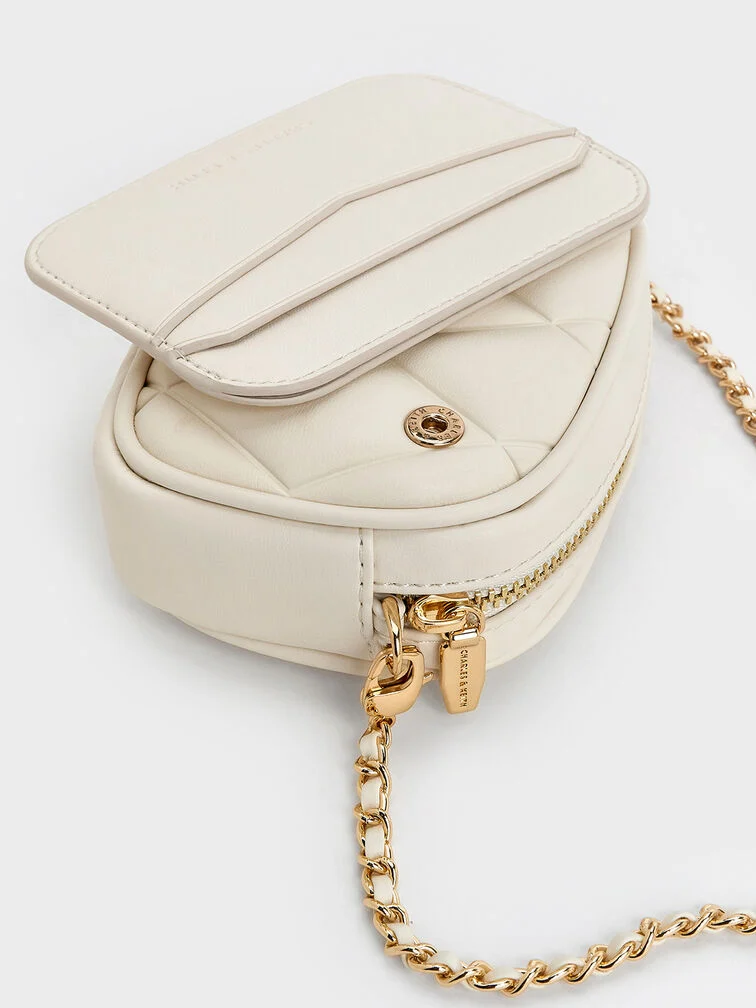 This cream Arwen offers versatility in spades. With rounded corners and a plush quilted finish, this mini bag can easily be dressed up or down. Plus, the main pouch compartment, back card section and braided chain strap are all detachable -- use them together or separately to suit your needs.