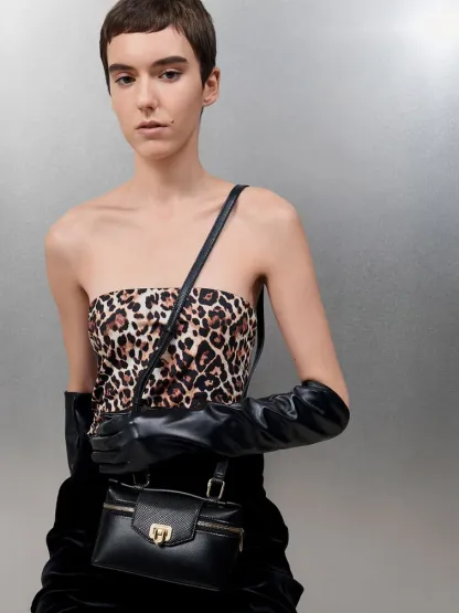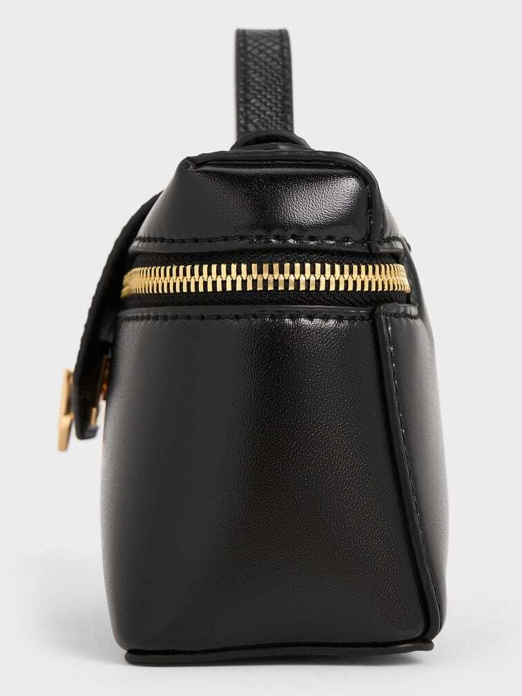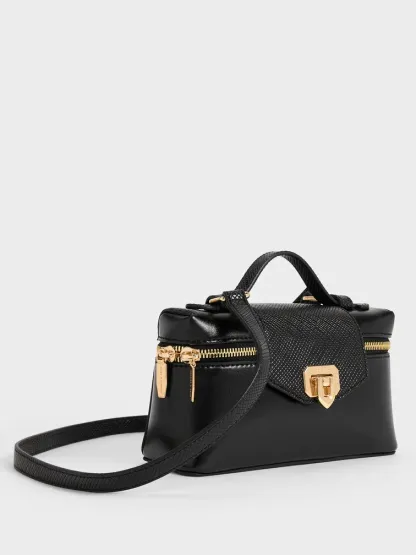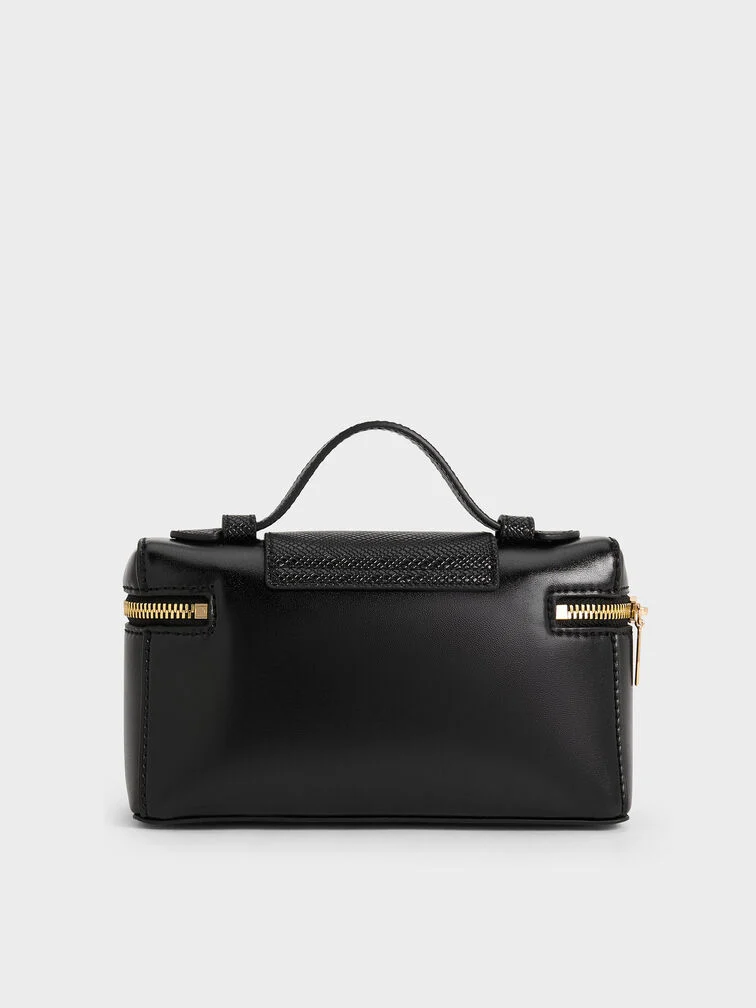 Made for the classy minimalists, this Arwen vanity bag is a timeless classic. Featuring a top-handle silhouette and foldover top, it evokes the charm of vintage vanity cases with its boxy shape. Functionality-wise, it will provide ease of access to your essentials while keeping them secure with the push-lock closure. In sleek black, it will go with almost everything, so you can either carry it by hand or attach the shoulder strap for a hands-free option.