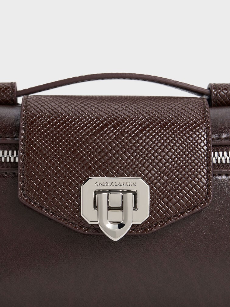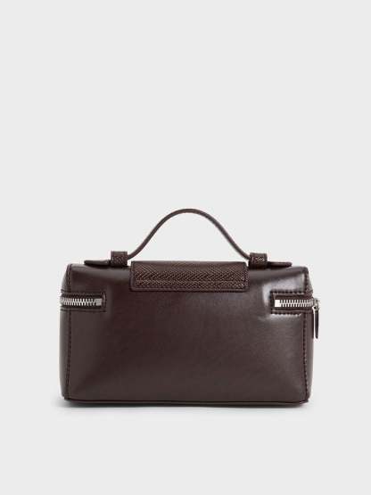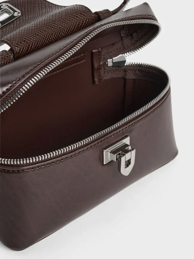 This dark plum Arwen bag evokes the charm of vintage vanity cases with its sleek, boxy shape. Despite its compact size, it boasts remarkable functionality, featuring a top zip-around design that offers ease of access to your essentials and a distinctive push-lock closure that keeps them secure. Whether carried by hand or worn crossbody with the detachable shoulder strap, it presents a stylish and hands-free option for any occasion.