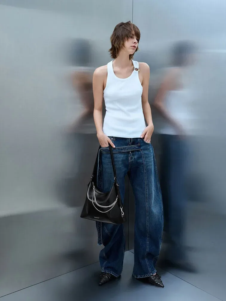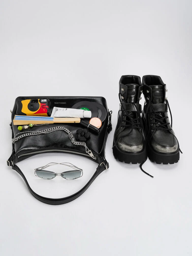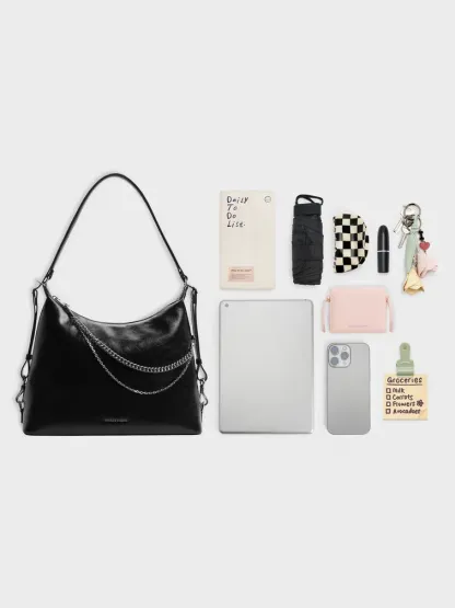 This Atwood hobo bag in black features a chic distressed finish, double-chain embellishments, a buckled adjustable strap, and a top-zip closure. It also comes with a detachable shoulder strap. Carry it to anchor both workday and weekend outfits.