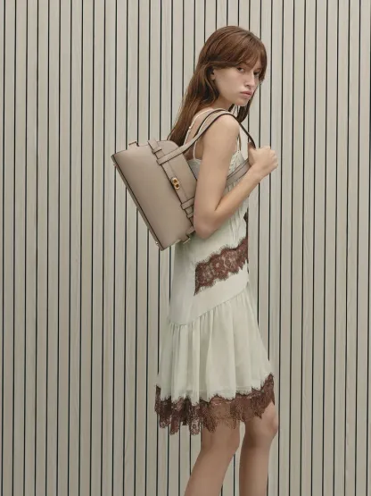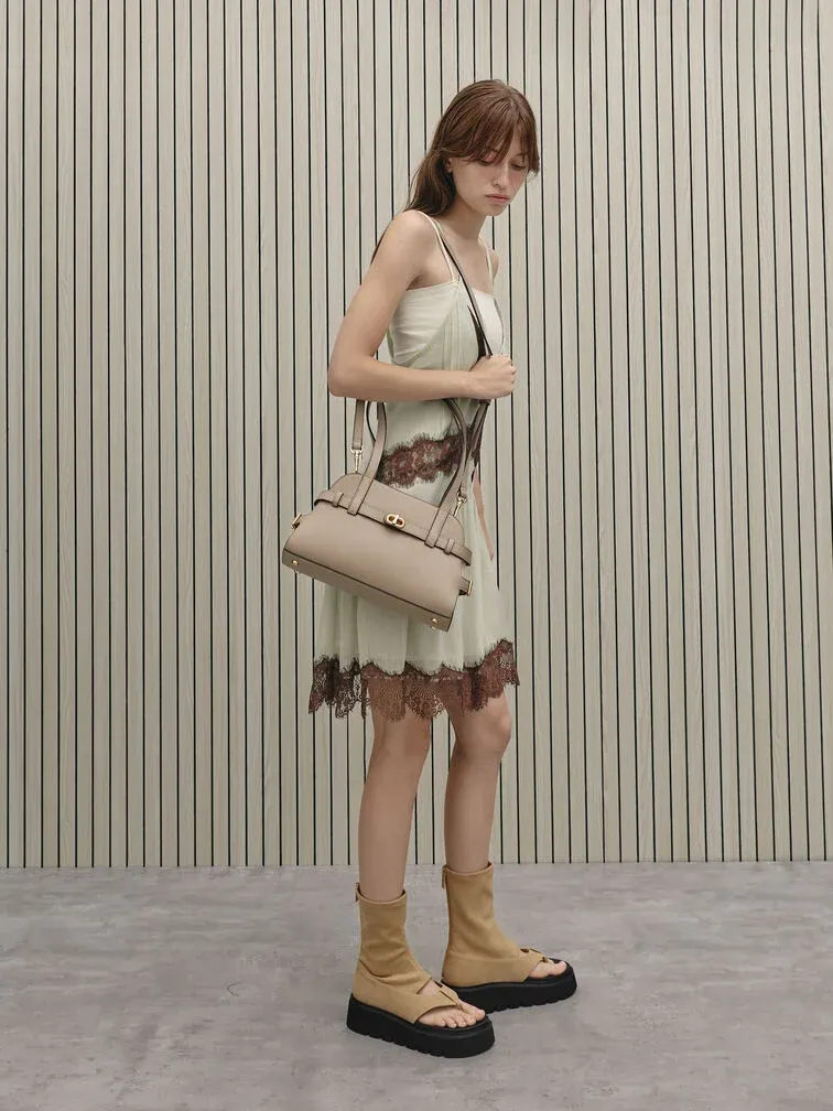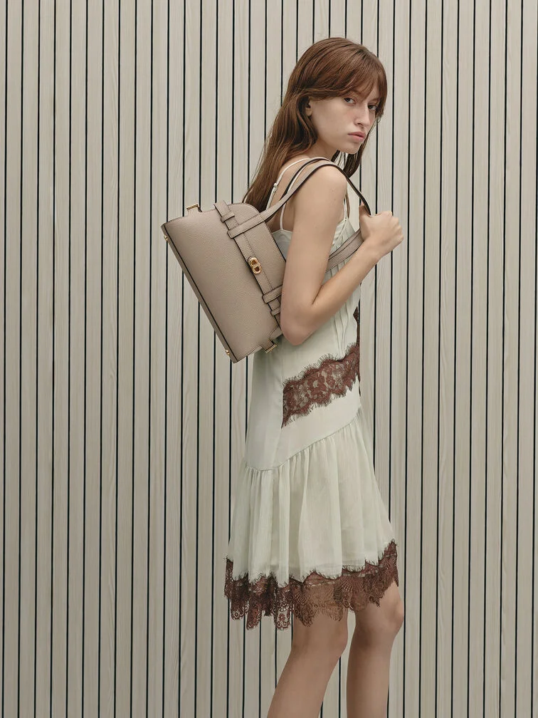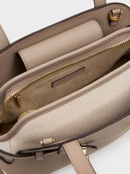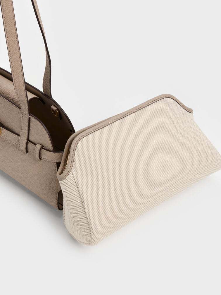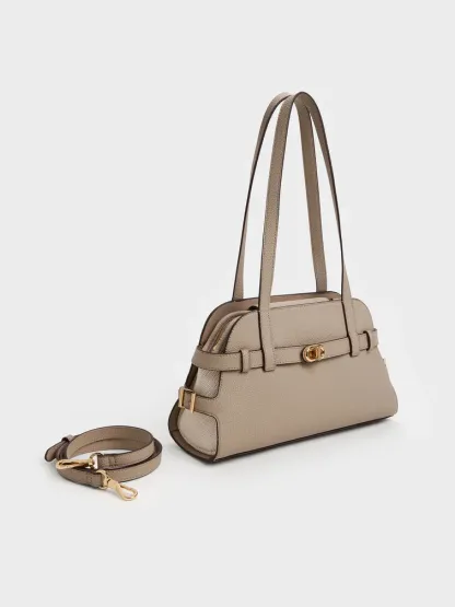 This Aubrielle shoulder bag in taupe features a trapeze silhouette, buckled straps across its canvas sides, a belted design with a gold-tone buckle and elongated double handles. Use it to soften tailored separates with its light-tone neutral hue and minimalist design.