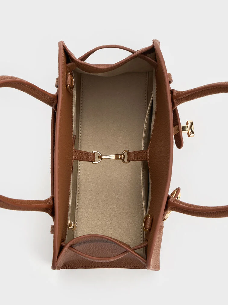This Aubrielle tote bag in chocolate features a trapeze silhouette, structured top handles, a belted design with a gold-tone buckle and a detachable shoulder strap for versatility. Use it to add subtle polish to smart separates and softly tailored layers.