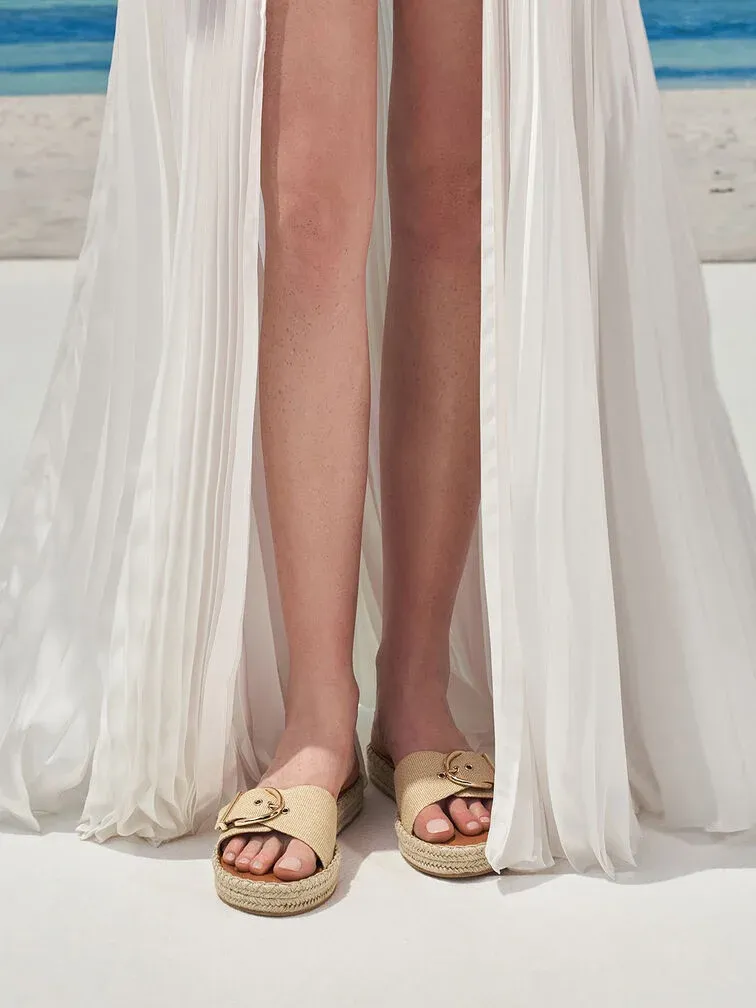 These slip-on espadrille sandals are the perfect casual footwear for laid-back vacation days by the beach. In beige -- a great alternative to black and white if you are looking for neutral-toned shose -- this pair feature simple straps across the vamps that are complemented by shiny gold-toned buckles. Standing on thick braided-rope soles, these shoes will look perfect with a white summer dress or classic denim cut-offs.