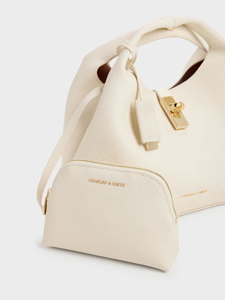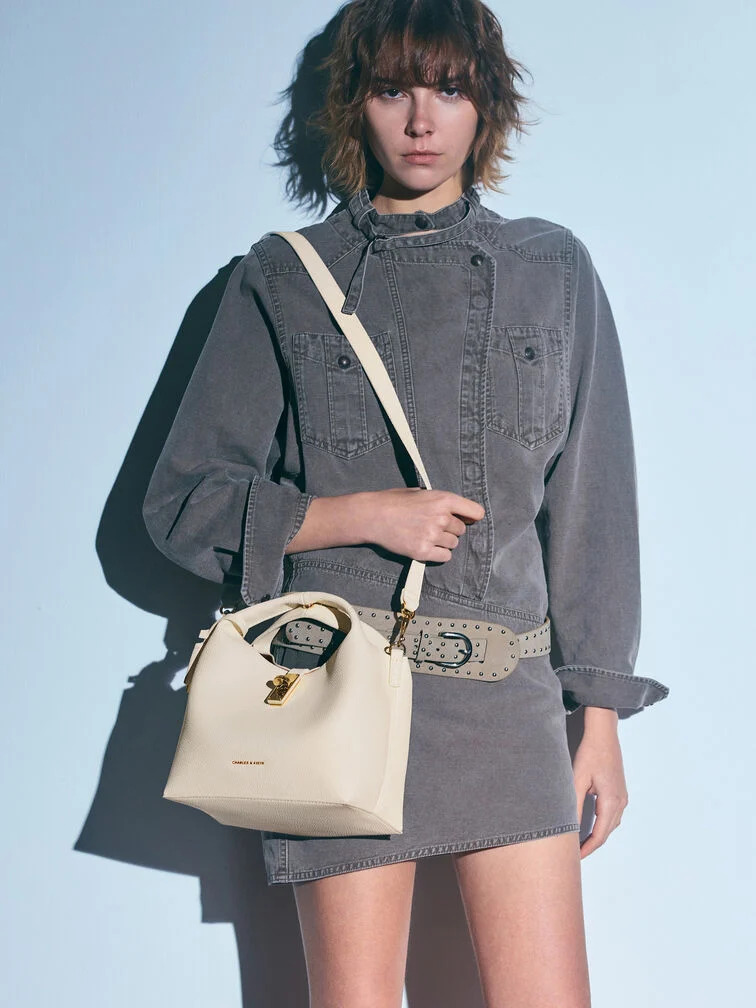 This Chance bucket bag in cream a turn-lock closure, a softly structured silhouette and a spacious interior. Use it to brighten dark-hued looks or complement soft-toned ensembles with a striking element to create outfits that feels elegant and effortless.