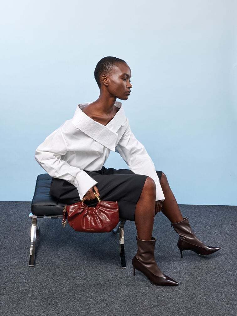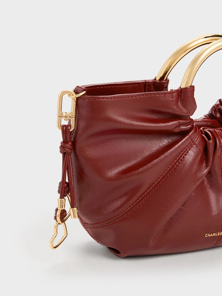This Ciara top handle bag in burgundy features a ruched design, a duo-heart charm, double metal-ring handles, an adjustable chain strap and a magnetic closure. It will elevate your everyday ensembles with a touch of rich colour.
