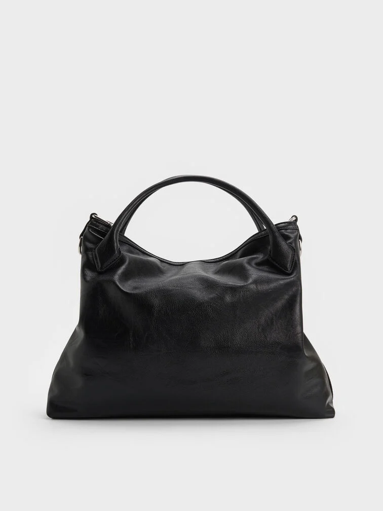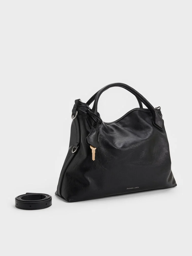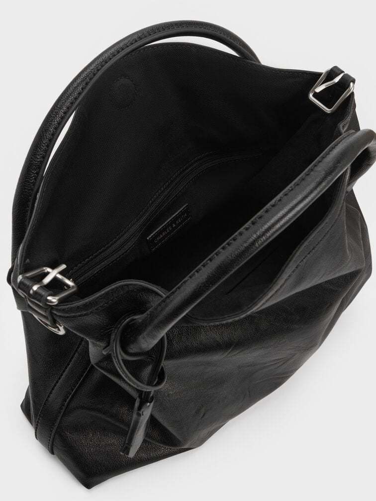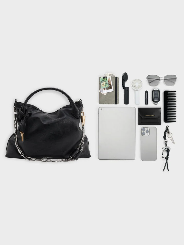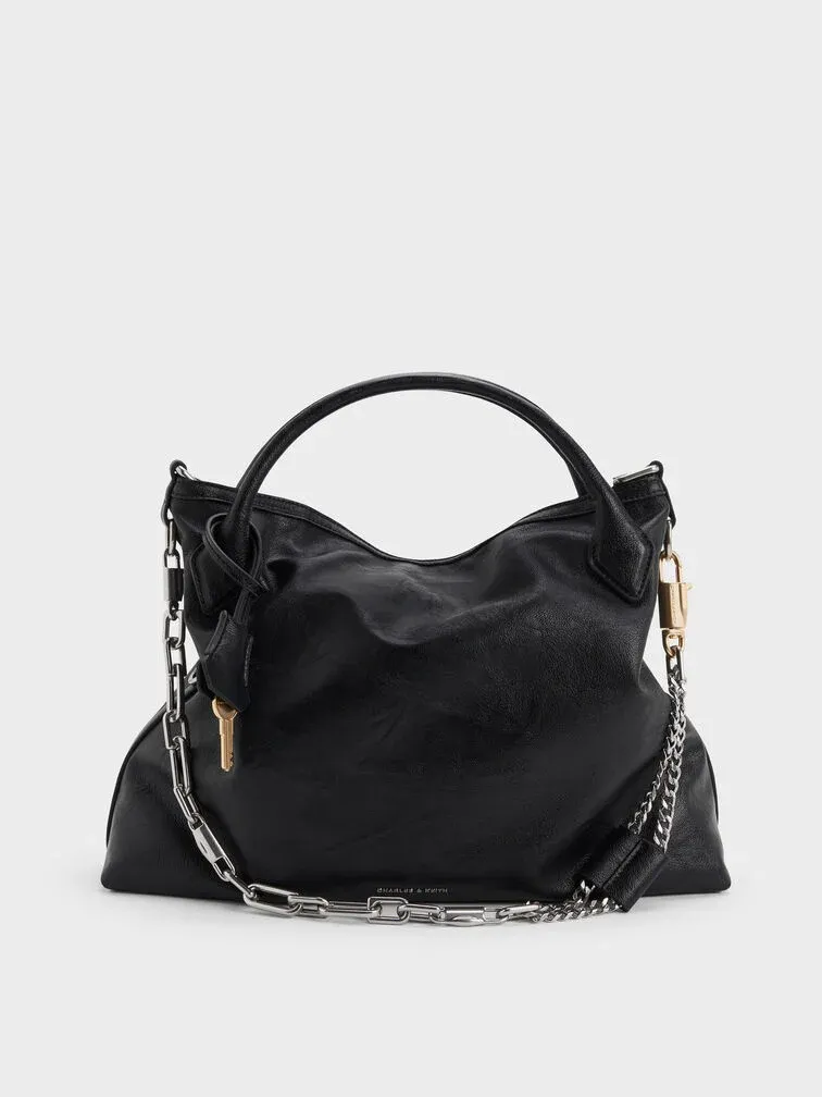 This Delfina tote bag in black features a slouchy silhouette, a buckled detachable strap, double handles, a magnetic closure, and an edgy chain strap. It will elevate comfortable all-day outfits with their striking silhouette and eye-catching details.