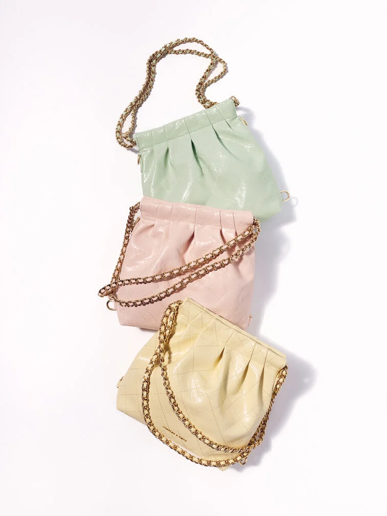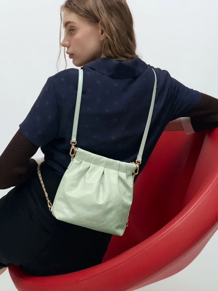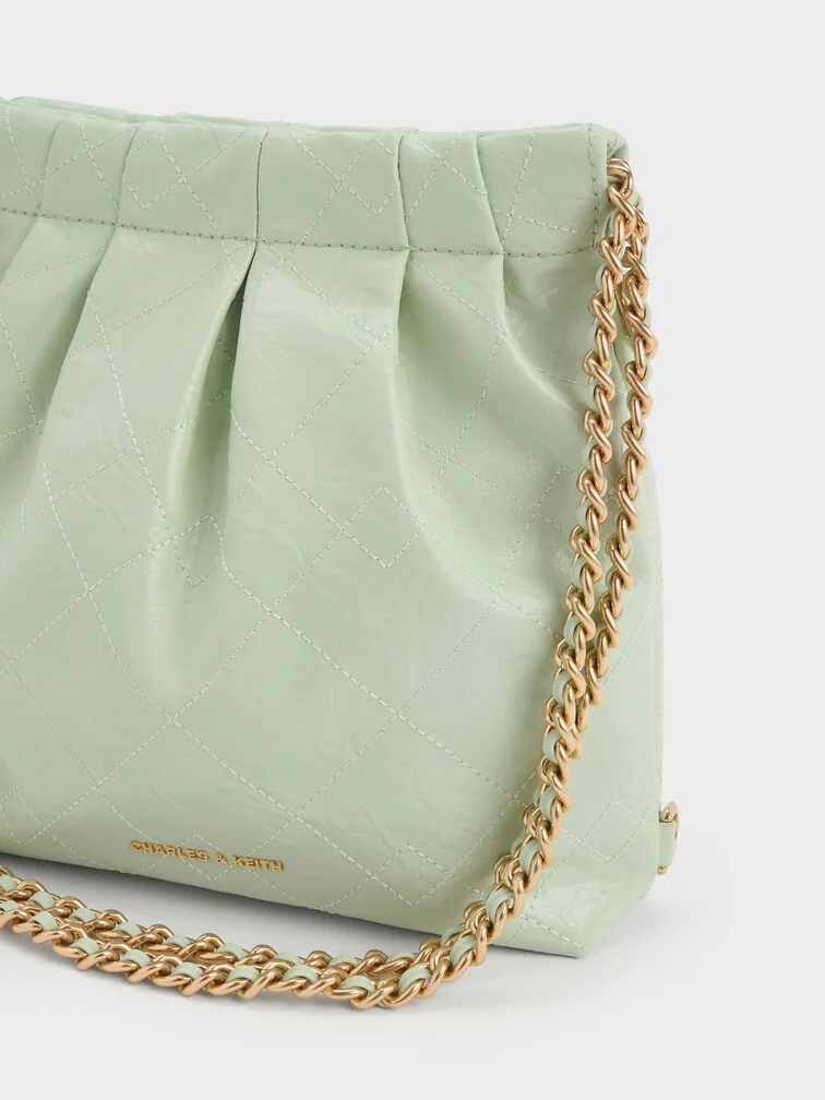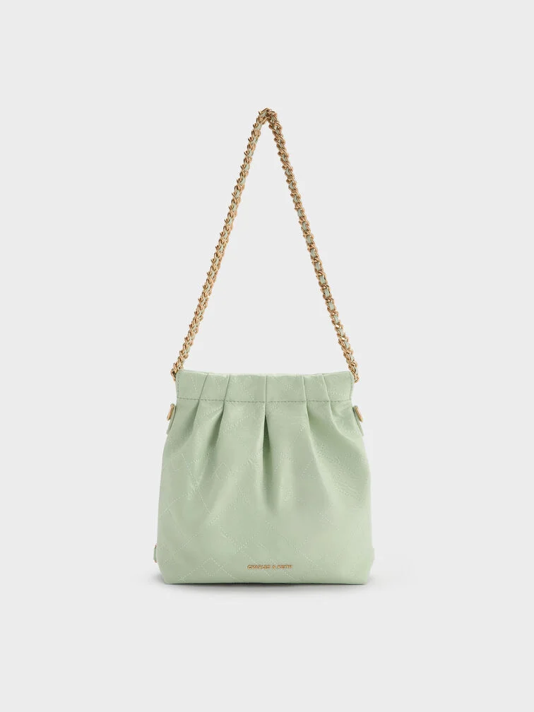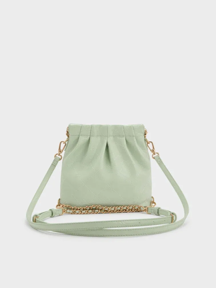 This Duo backpack in mint green features a quilted design, a secure magnetic closure and braided chain handles. Use this bag as a chic shoulder bag or convert it into a cute backpack with the detachable shoulder straps.