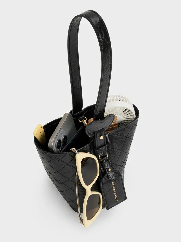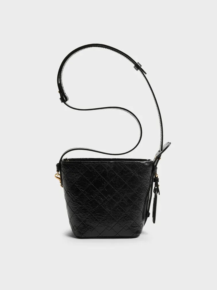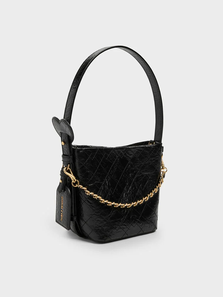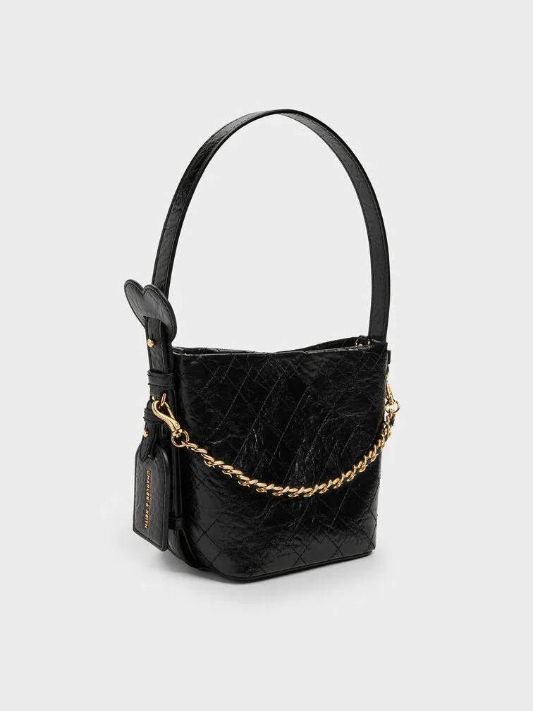 This Duo bucket bag in black features a quilted finish, a chain embellishment, a magnetic closure, a detachable card holder and a top-handle strap that is anchored by a heart-shaped detail at the side. Cinch in the sides of this bag for a structured and polished aesthetic, or unbuckled it for a casual and relaxed silhouette.