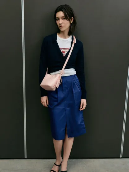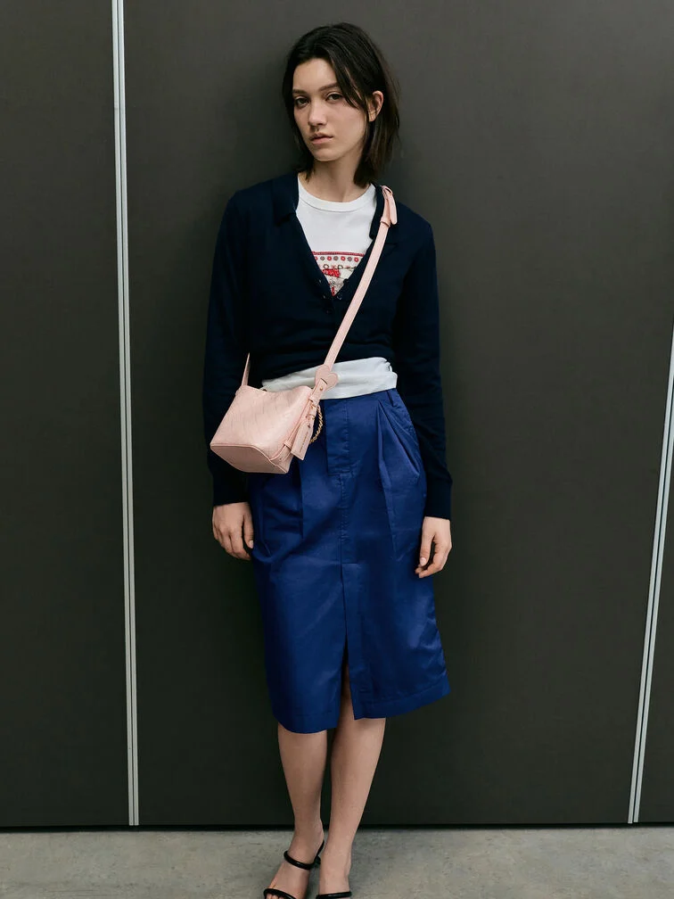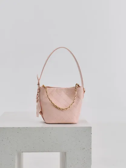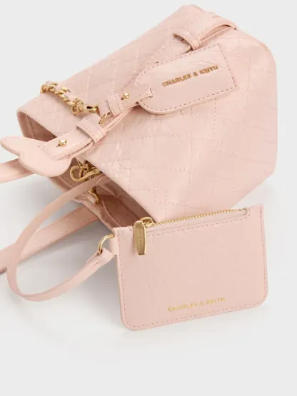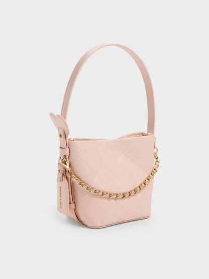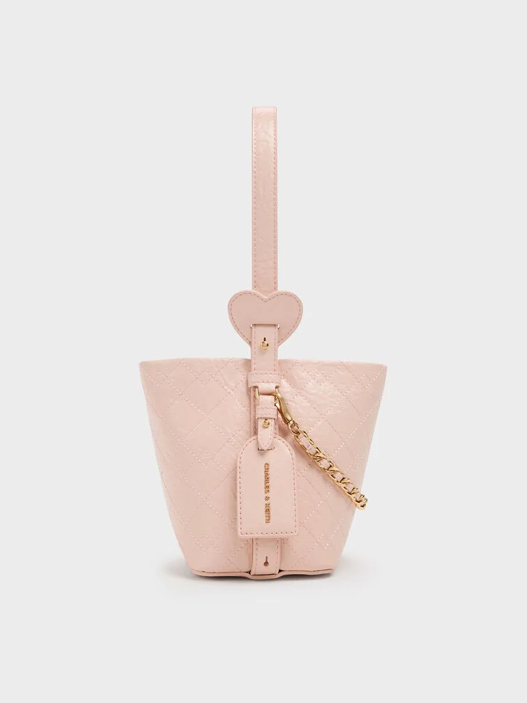 This Duo bucket bag in soft pink features a quilted finish, a chain embellishment, a magnetic closure, a detachable card holder and a top-handle strap that is anchored by a heart-shaped detail at the side. Use it to polish up smart workplace looks and softly tailored layers.