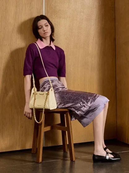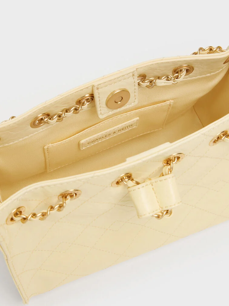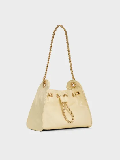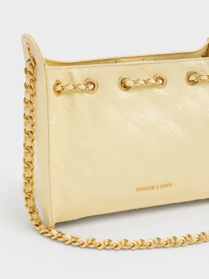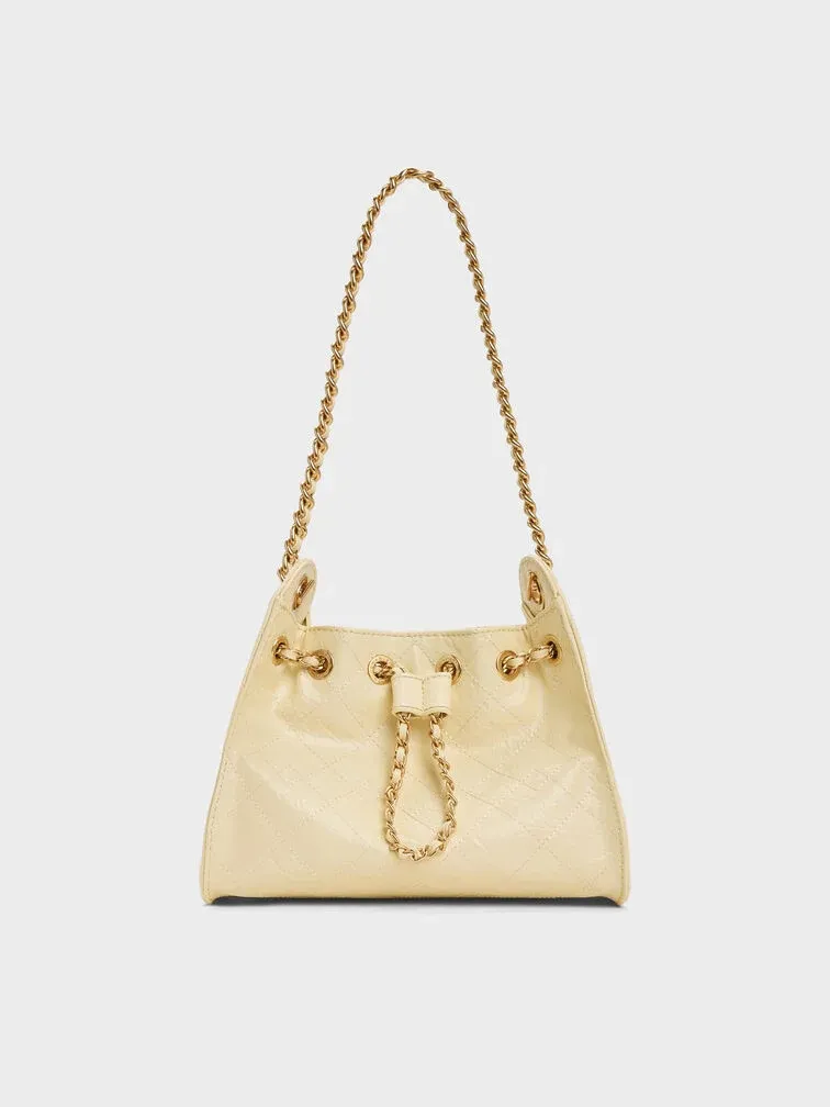 This Duo drawstring bucket bag in butter yellow features a distinctive quilted finish, a trapeze silhouette, a drawstring closure, a single braided-chain handle and a detachable shoulder strap. Carry it to add a mood-boosting pop of colour to both workday and weekend ensembles.