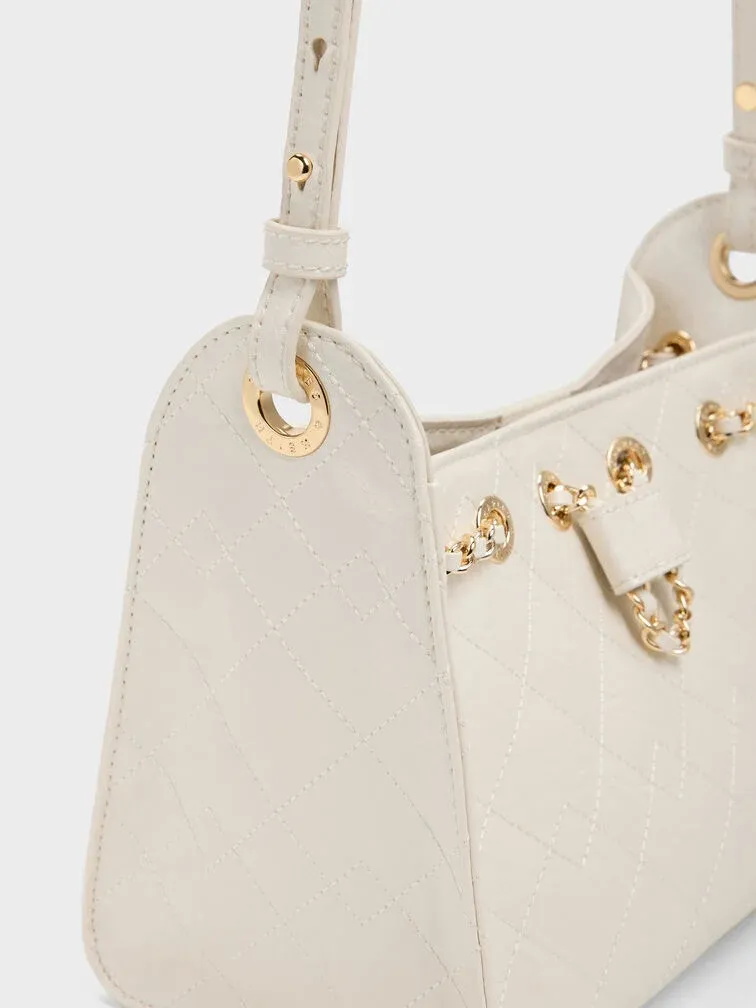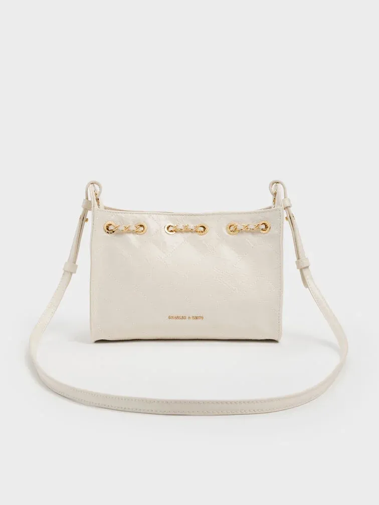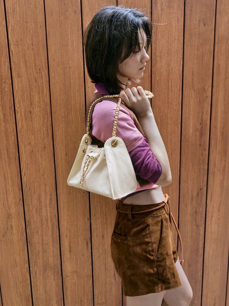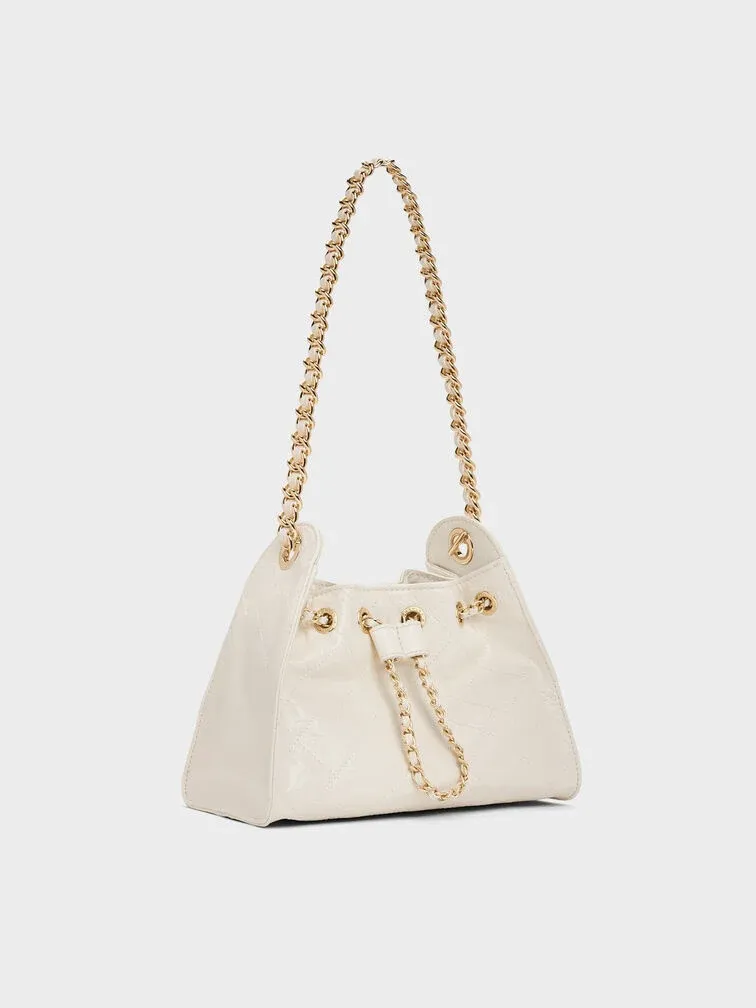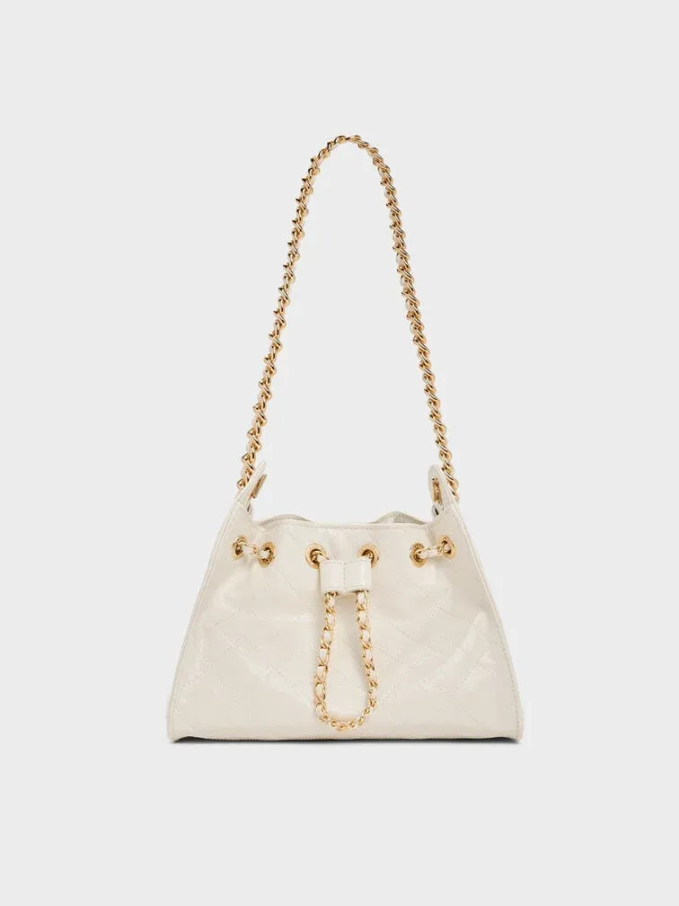 This Duo drawstring bucket bag in cream features a distinctive quilted finish, a trapeze silhouette, a drawstring closure, a single braided-chain handle and a detachable shoulder strap. This bag will match with everything in your wardrobe -- carry it to introduce tactility and visual interest to any outfit.