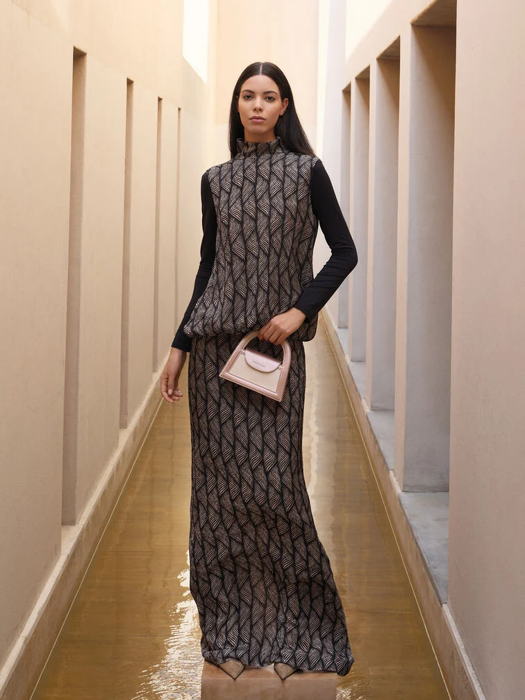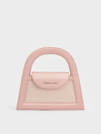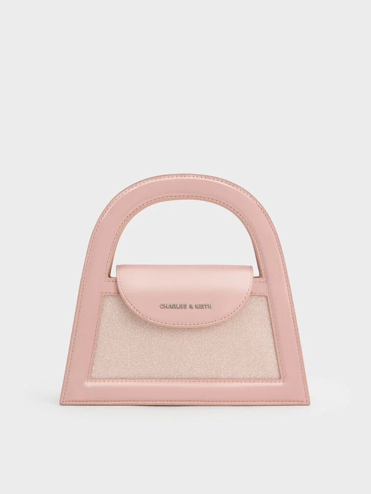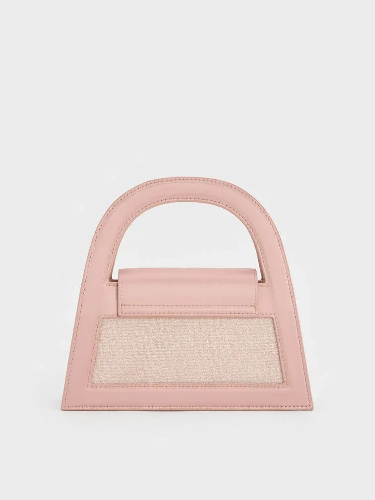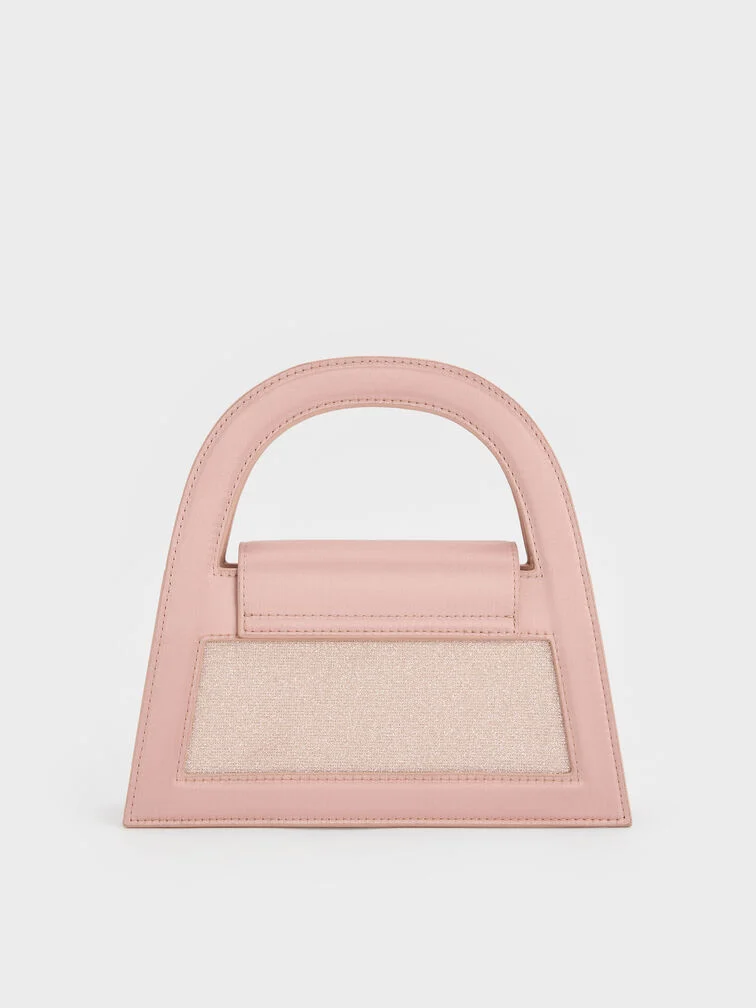 This Este top handle bag in pink is made with satin and features a glittered finish, curved double handles, a boxy trapeze construction and a magnetic closure. Let them complement bold special-occasion outfits with their outstanding design.