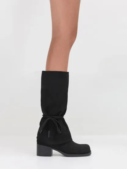 These knee-high boots in black are made with faux suede and feature tie-around laces, chunky block heels, handy side zips and rounded square toes. Wear them with long coats or fluid dresses to create effortless yet outstanding winter looks.