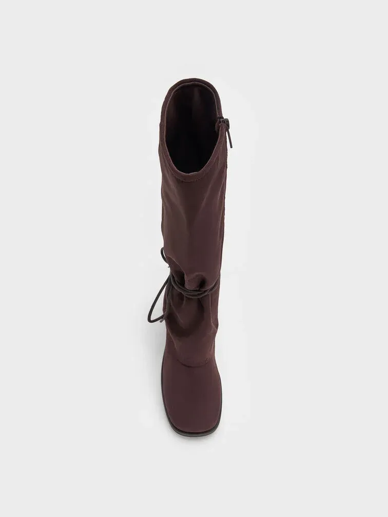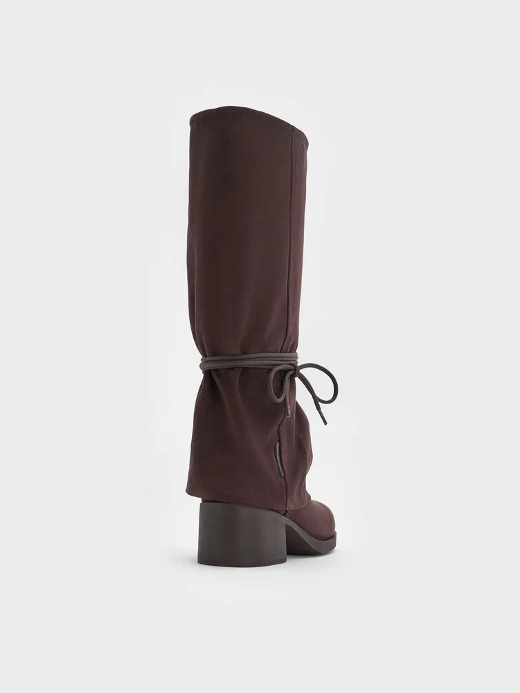Faux Suede Tie-Around Knee-High Boots - dark brown textured