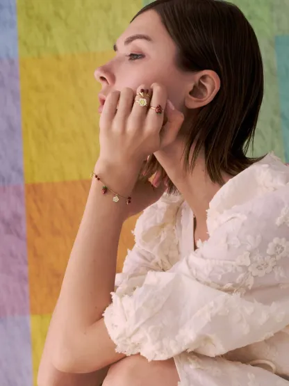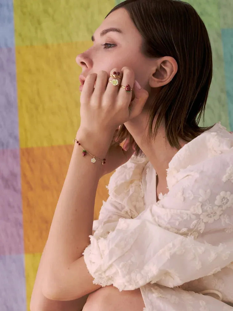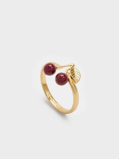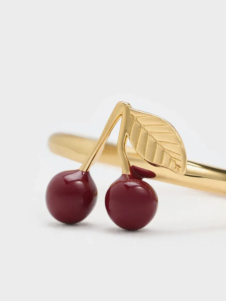 This Francie ring in gold features a polished band, two red cherries hanging off sculpted stems and a finely etched leaf. This fun and eye-catching piece will be a conversation starter during the warmer months.