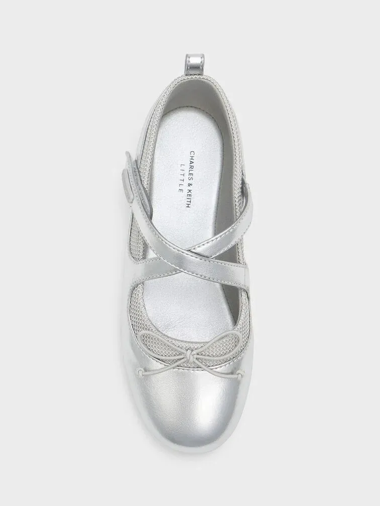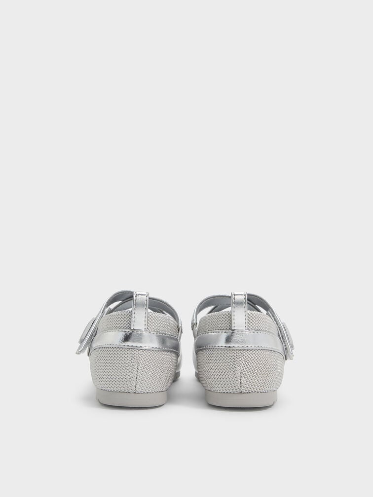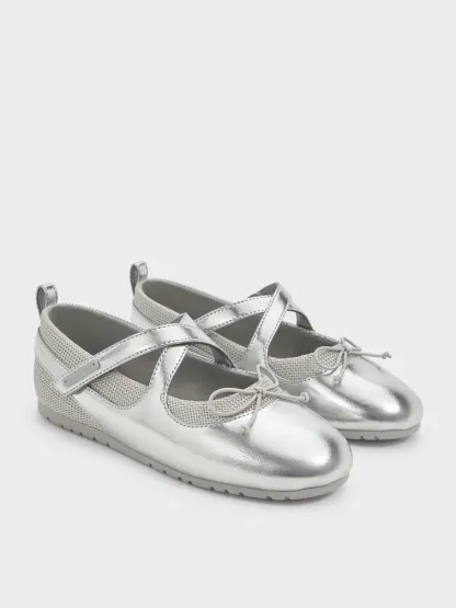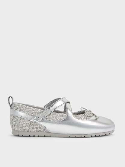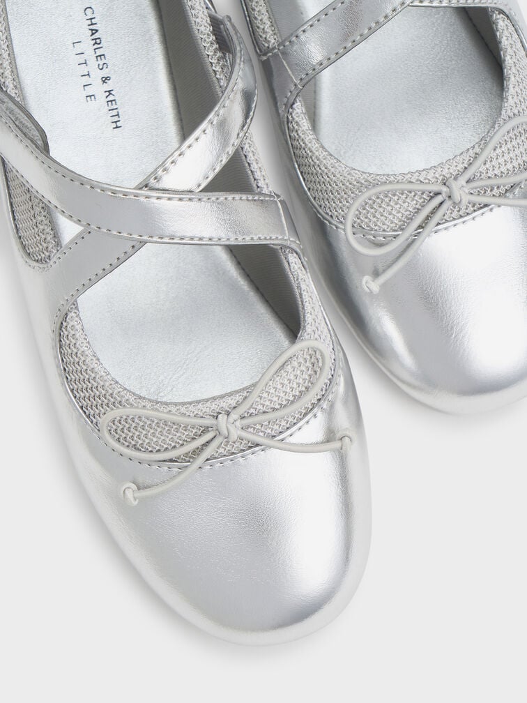 These Mary Jane sneakers for girls in silver feature a glossy metallic finish, crossover-strap uppers, airy mesh panels, dainty bows, covered round toes, back pull-tabs and cushioned flat soles for all-day comfort. Let your little girl pair them with lightweight cotton dresses for charming daytime outfits.