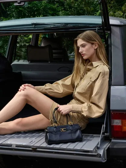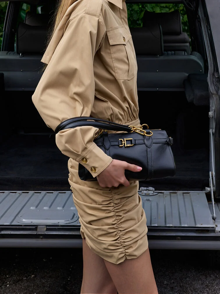 This Gwynne elongated shoulder bag in black features a sleek east-west silhouette, stitch-trim strap details, gold-tone metallic accents, adjustable side buckles, a top-zip closure and double handles. Style it with tailored separates for an outfit that will take you from desk to dinner.