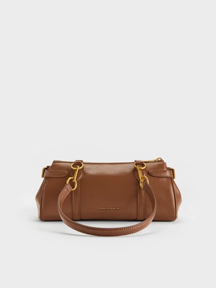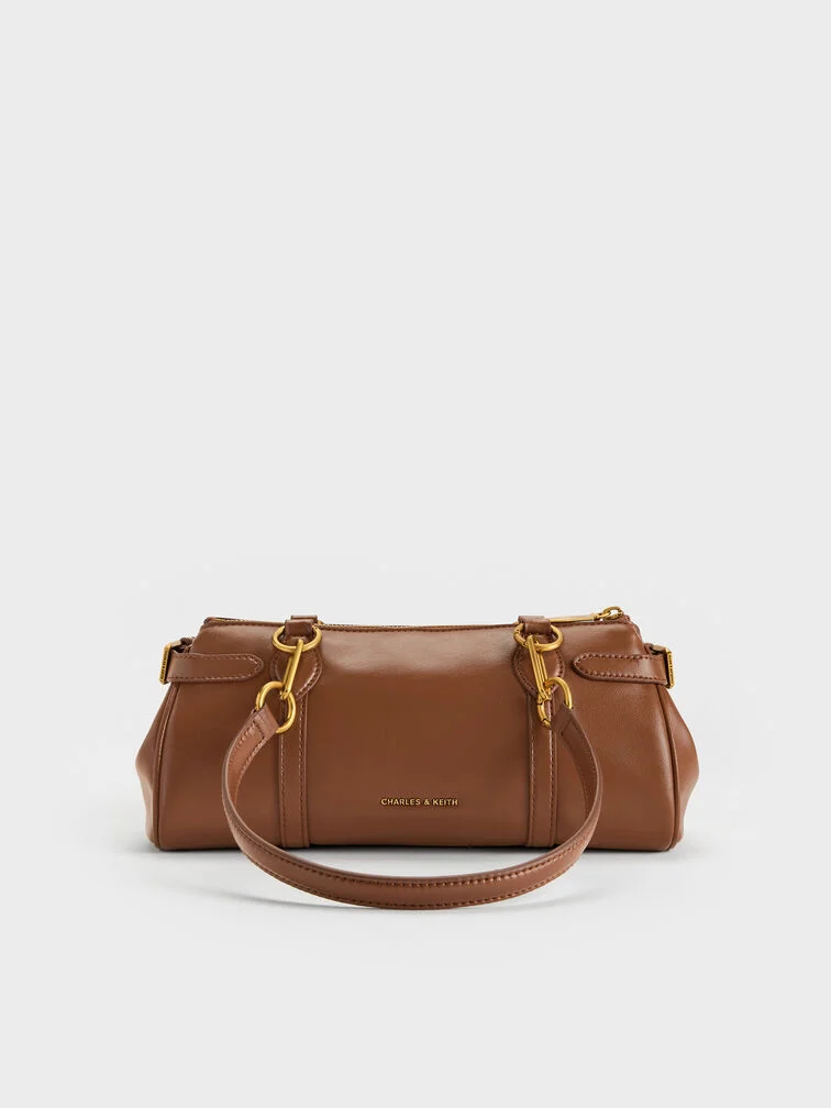 This Gwynne elongated shoulder bag in chocolate features a sleek east-west silhouette, stitch-trim strap details, gold-tone metallic accents, adjustable side buckles, a top-zip closure and double handles. Pair it with relaxed tailoring to bring a quiet confidence to your everyday outfits.