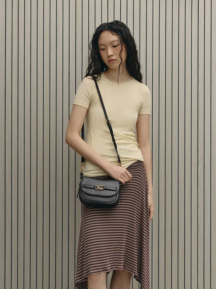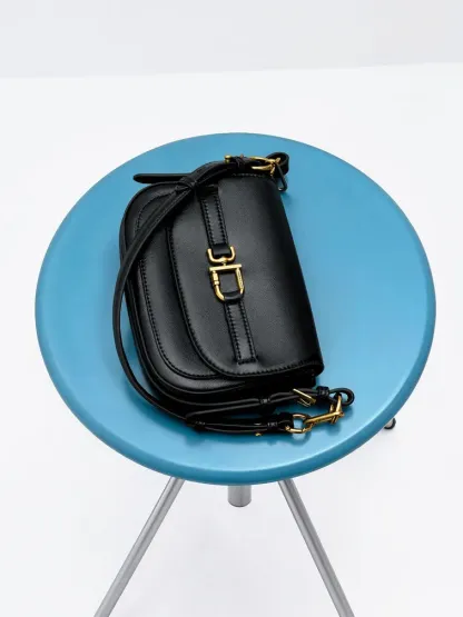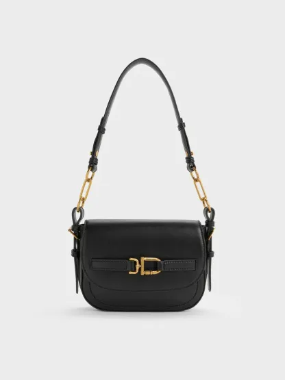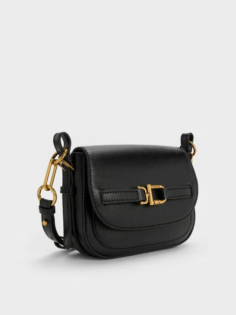 This Gwynne crossbody bag in black features a saddle silhouette with softly rounded edges, a curved front flap with a belted detail, striking metallic accents and two detachable shoulder straps. It will easily hold all your daily essentials.