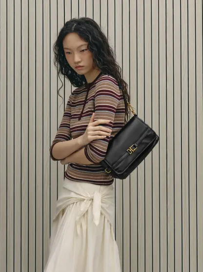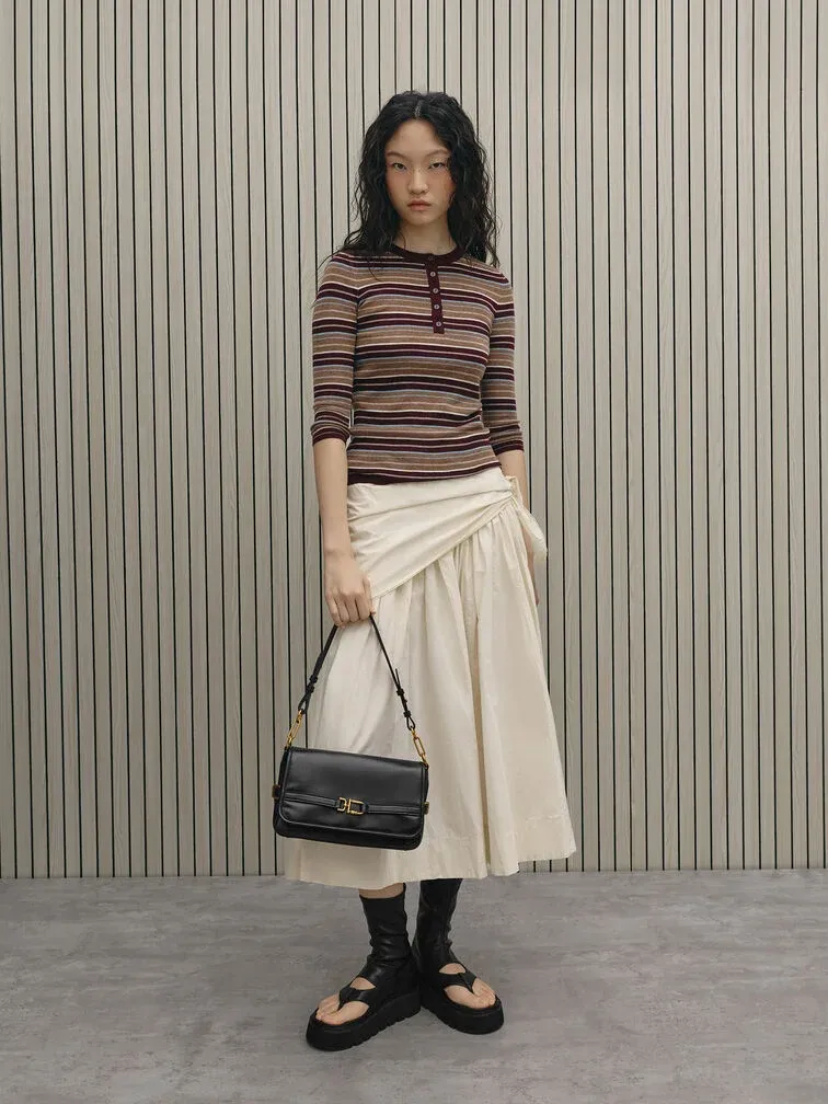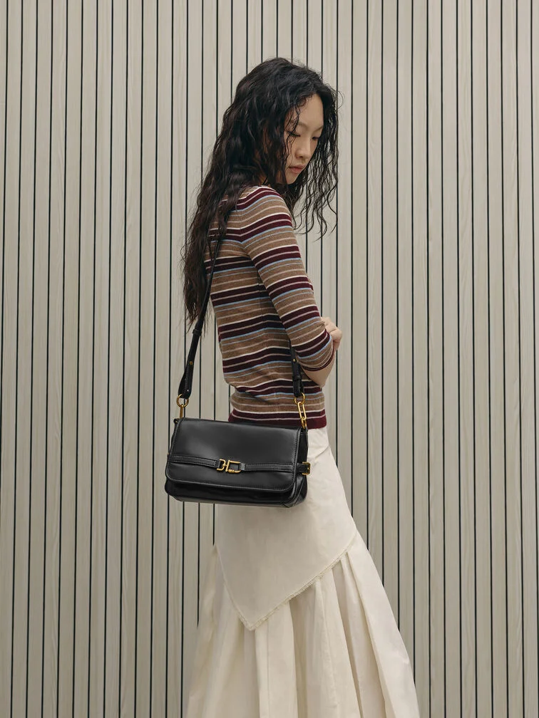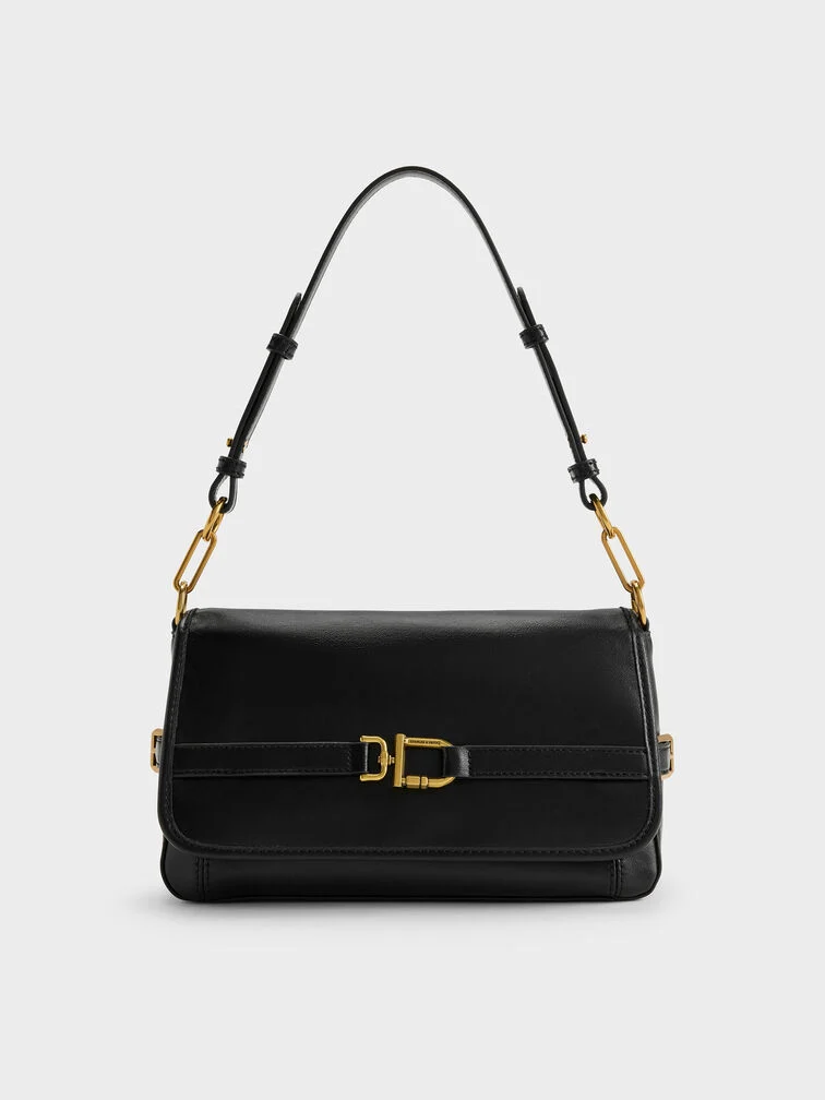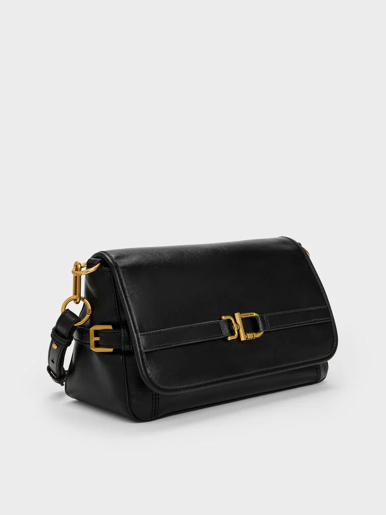 This Gwynne shoulder bag in black features a softly structured silhouette, a classic rectangular shape with a front-flap closure, a belted metallic-buckle design and two detachable shoulder straps for multiple ways of wear. Carry it with tailored separates for a refined finish.