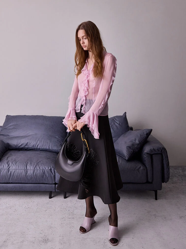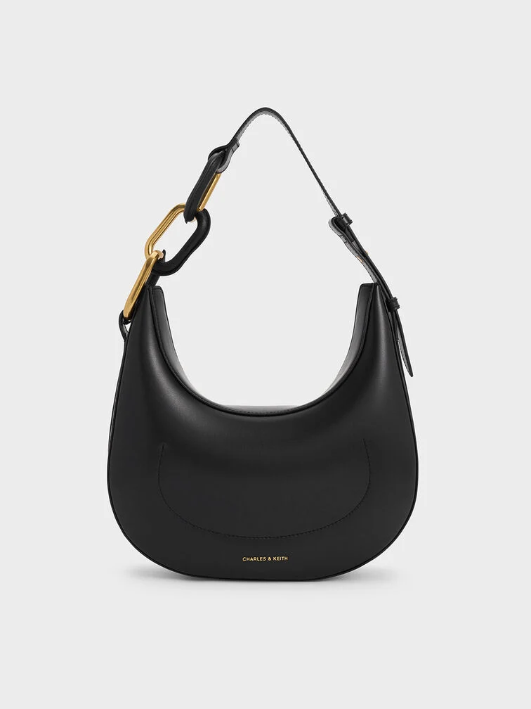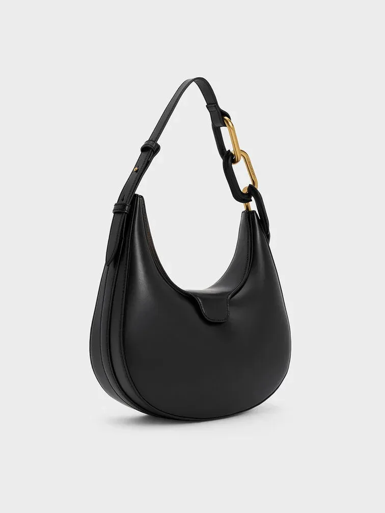 This Kora moon bag in black will easily become one of your favourite bags in your collection. First, in black, it will become a timeless piece which you can use for any occasion. The smooth moon silhouette will add stylish structure, making it the perfect piece to play up your outfit with proportions. Plus points for the chunky chain accents that add subtle shine and a distinctive touch that will elevate any look. With magnetic flaps that keep your belongings easily accessible yet secure, you will be able to carry this around all-day with ease.