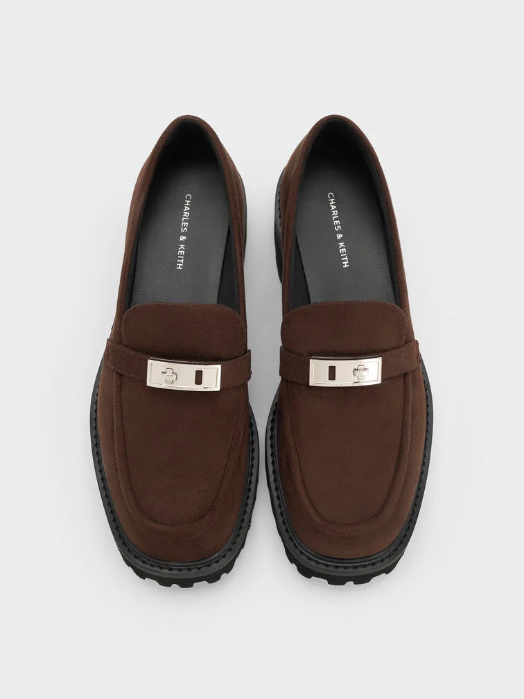 These Lando loafers in dark brown feature a soft faux suede finish, ridged platform soles and silver metallic accents. They make for the perfect addition to any fall-winter wardrobe, grounding any outfit with a muted and understated touch.