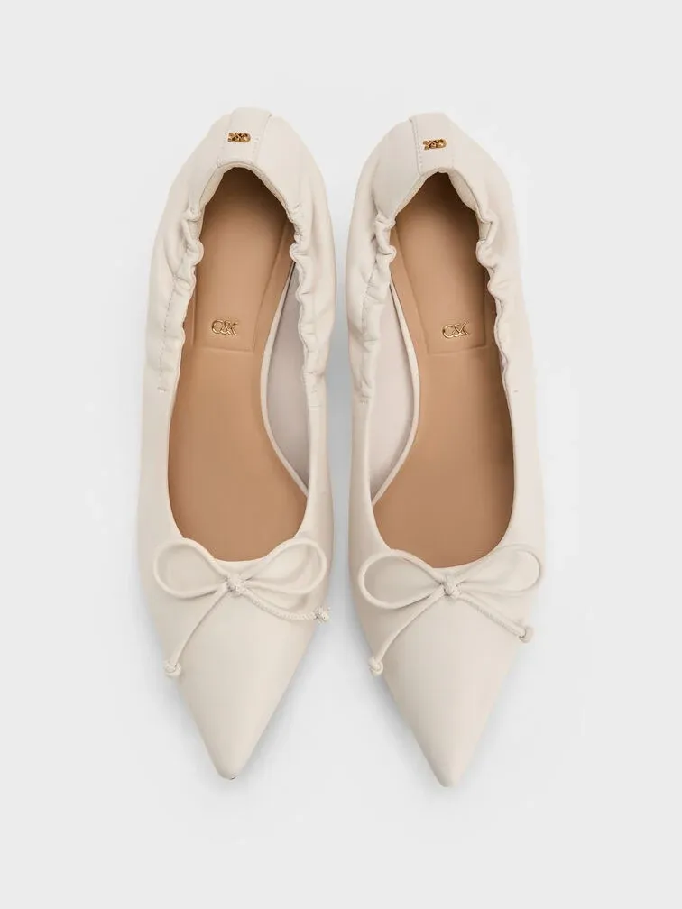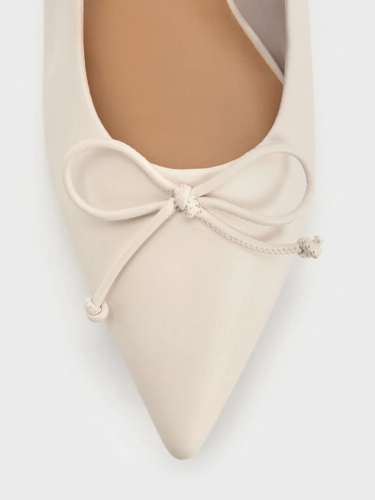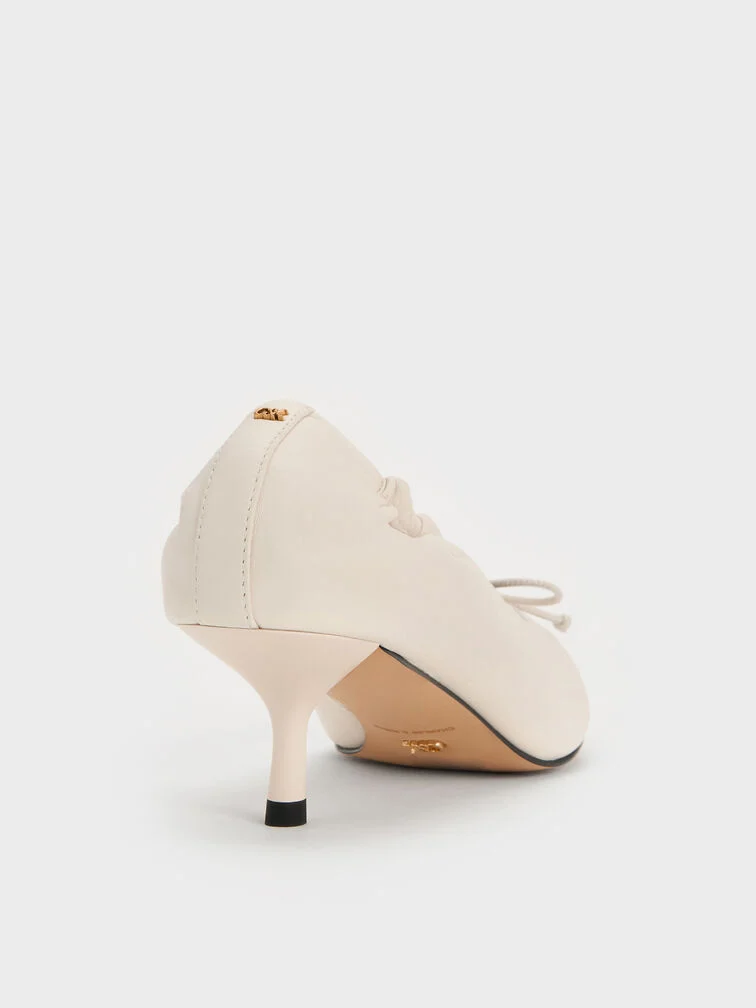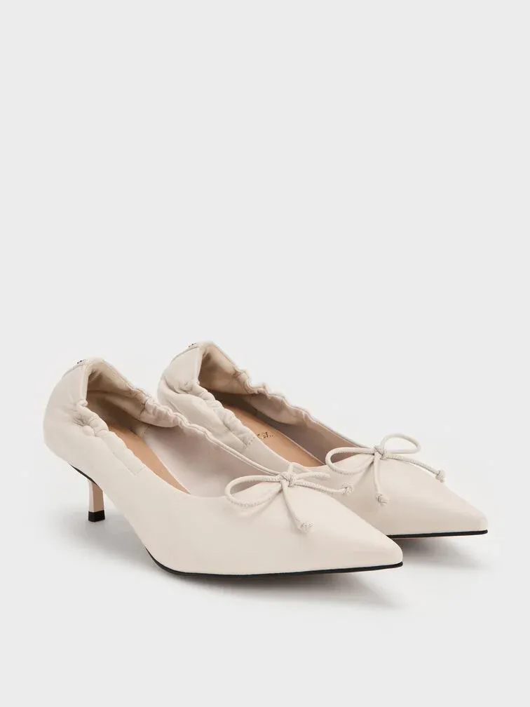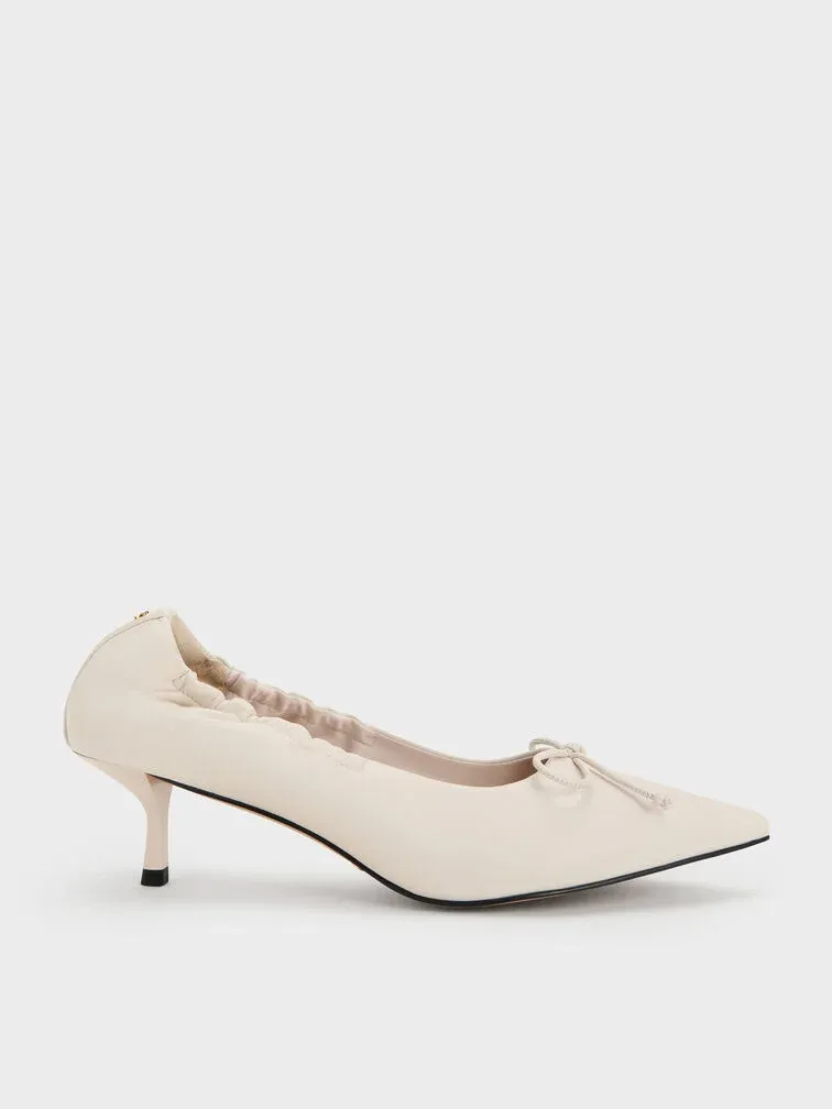 These heels in chalk are made with leather and feature ruched elasticised sides, dainty bow details, covered pointed toes and slender kitten heels. Let them complete a classic shirt-and-jeans ensemble with their simple yet striking aesthetic.