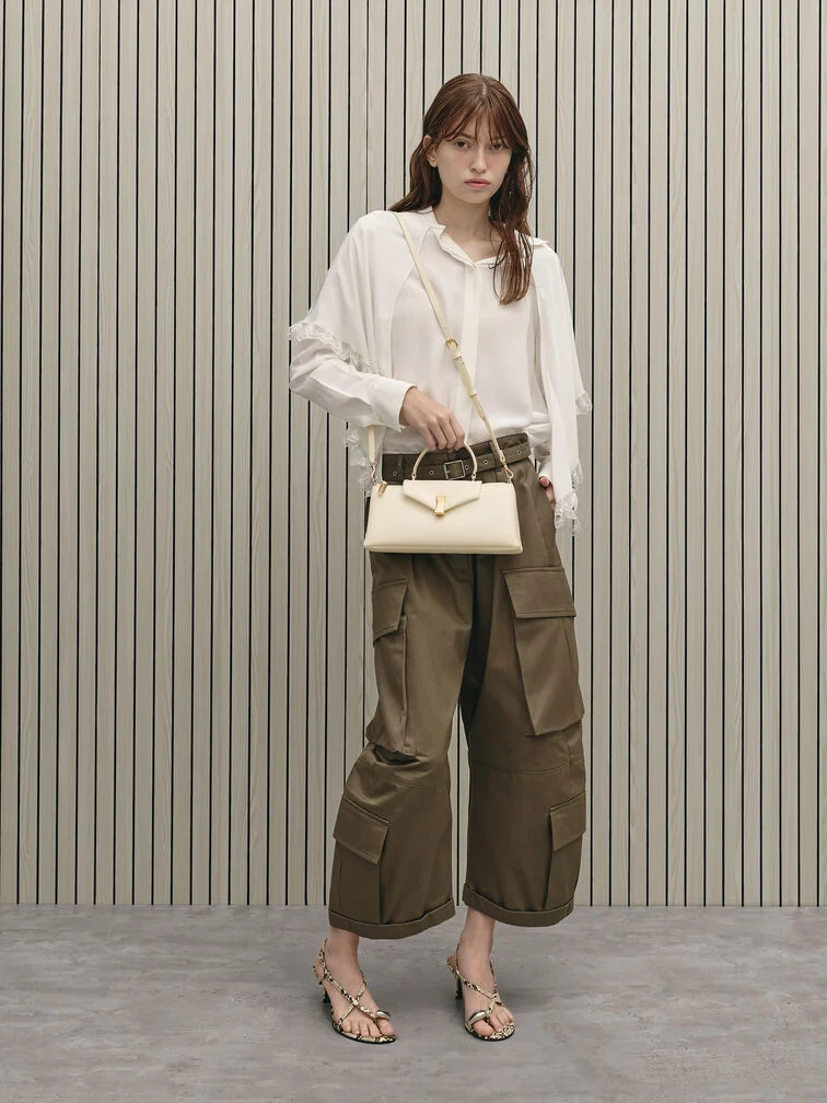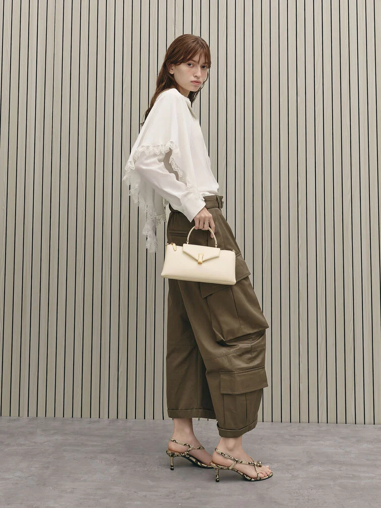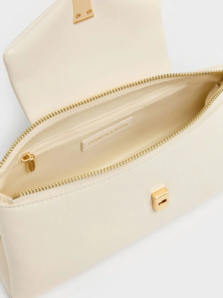 This Lilibet top handle bag in cream features an east-west silhouette, an envelope flap with a gold-tone push-lock clasp, a top handle and a detachable shoulder strap. Carry it to bring soft colour and polish to relaxed day-to-night outfits.
