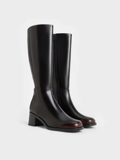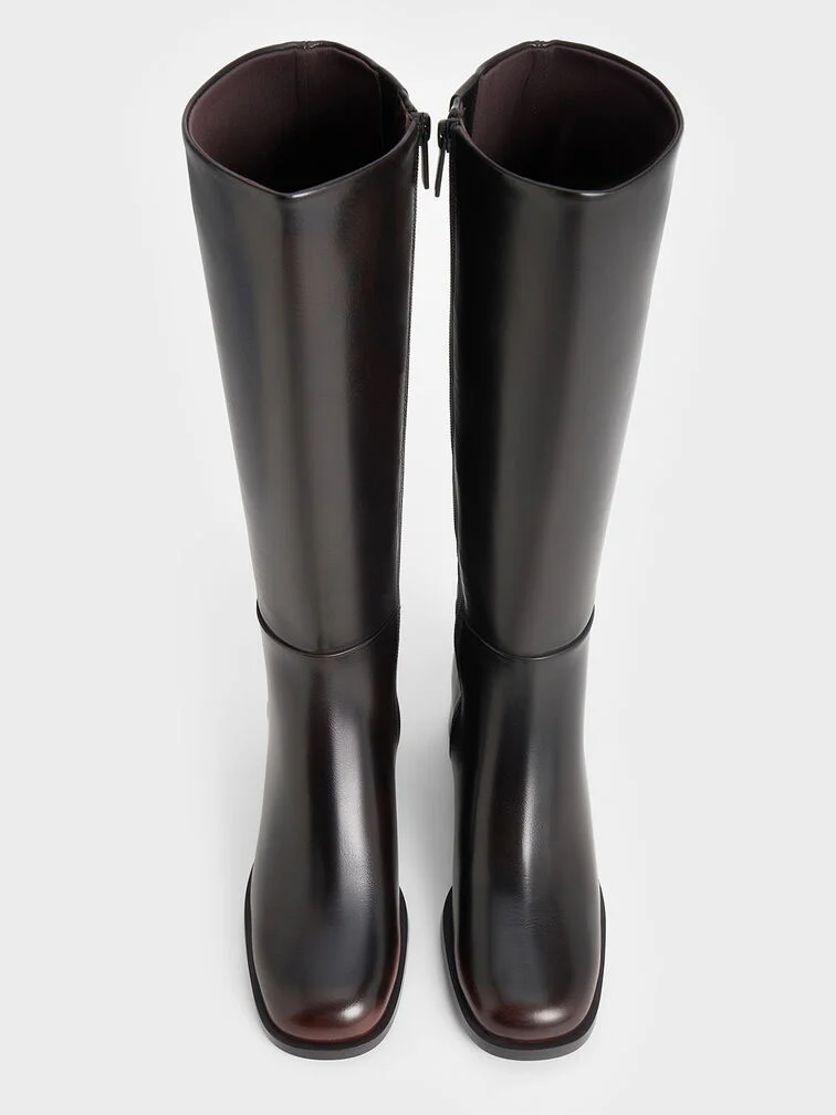 The Louise knee-high boots offer a stylish alternative to your usual black pair. With a minimalist and versatile design, they can be paired with anything, while the burnished dark brown finish adds rich texture and dimension. Set on chunky block heels, they promise all-day comfort. Style them with anything from wide-leg jeans to mini dresses for an effortlessly polished look.