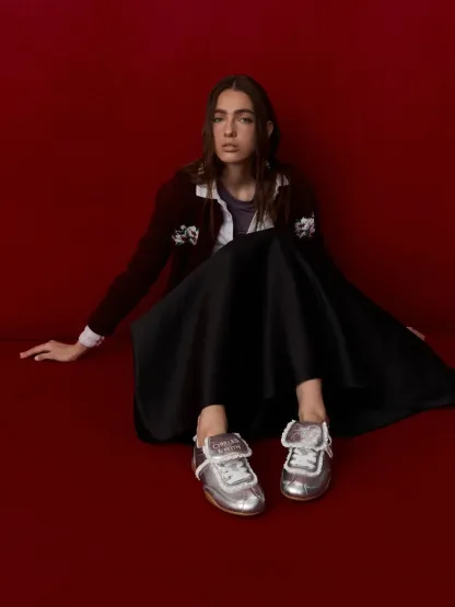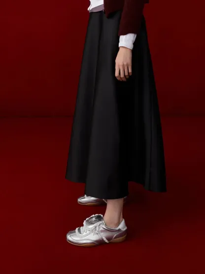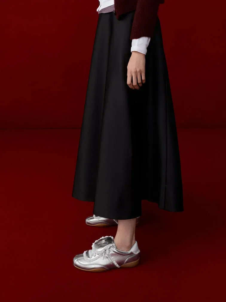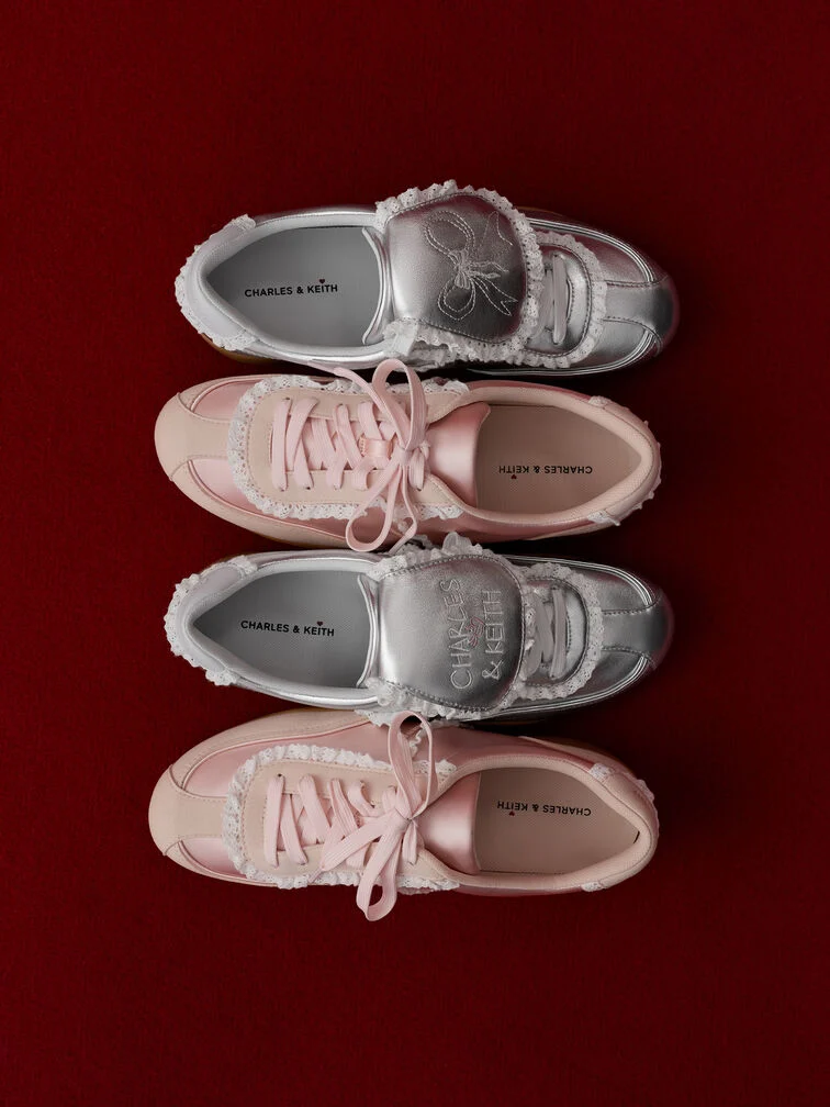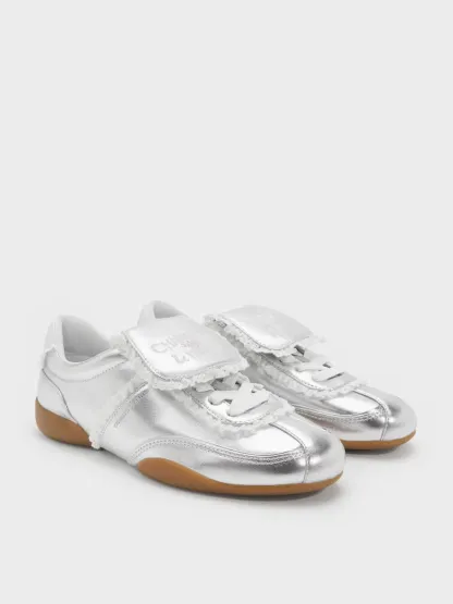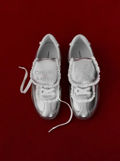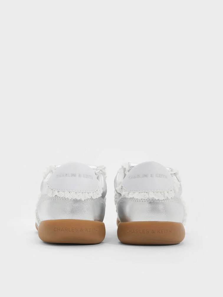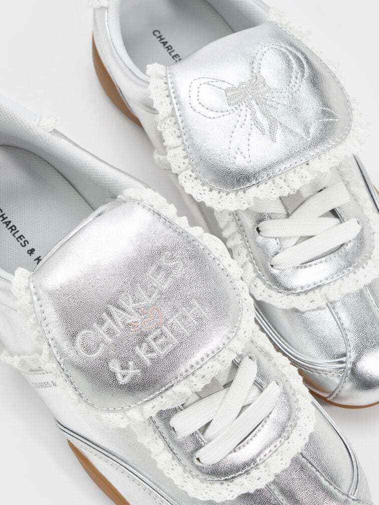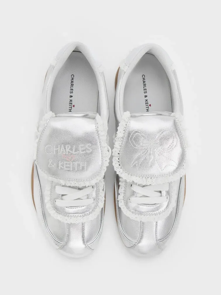 These Louise sneakers in silver feature a metallic finish, lace-trim detailing, contrast panels and detachable front flaps for versatile styling. Each flap features a distinct design -- one is embroidered with the CHARLES & KEITH logo while the other is marked with a bow motif. Use them to introduce a touch of playfulness and shine to your everyday outfits.