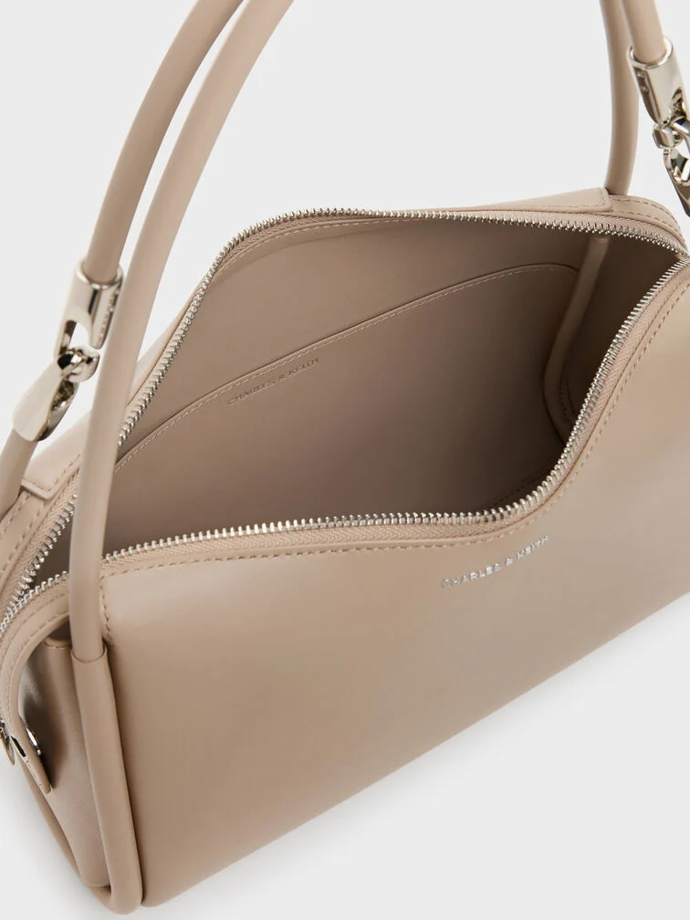 This Lyla shoulder bag in taupe features a soft slouchy silhouette, tubular double handles, striking metallic accents, a double-zip closure and a detachable shoulder strap. It will balance tailored separates with its soft texture and relaxed shape.