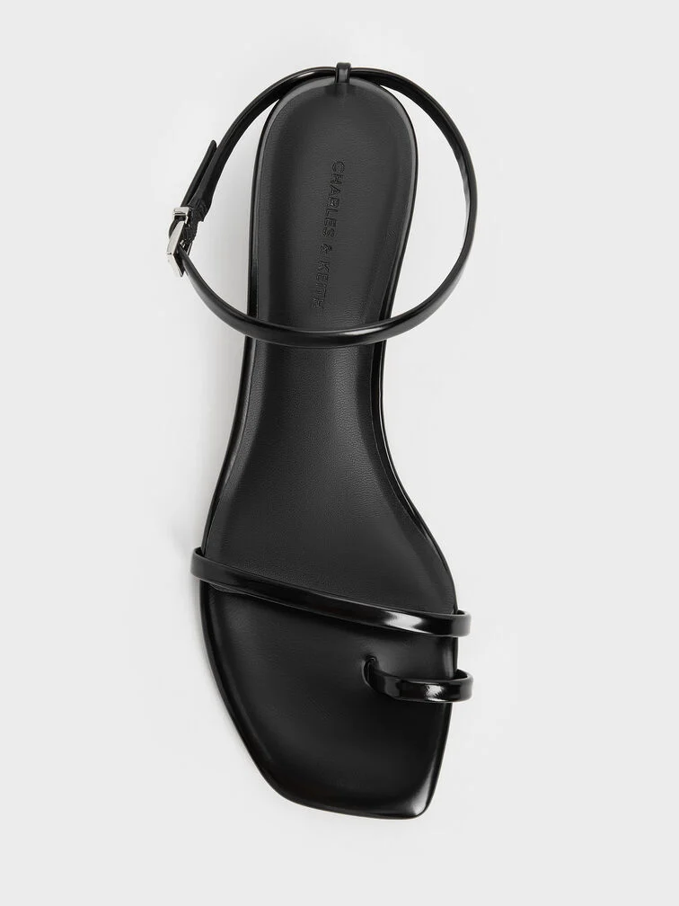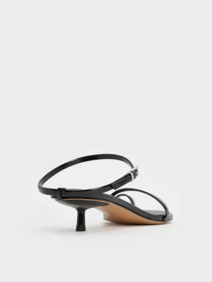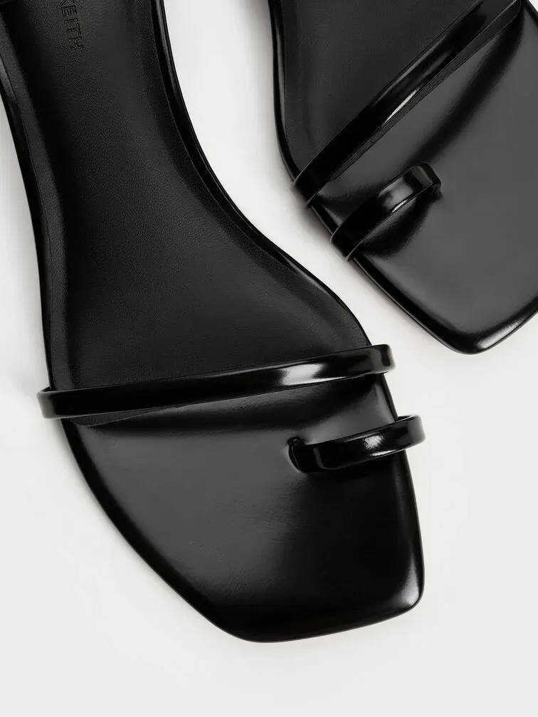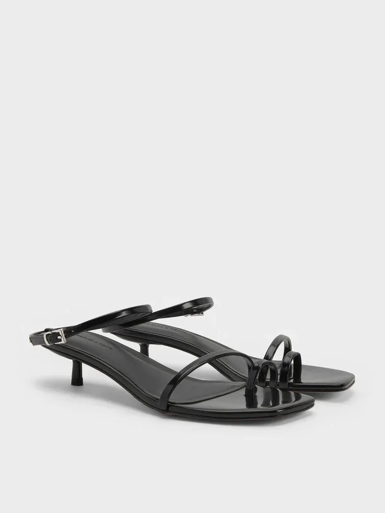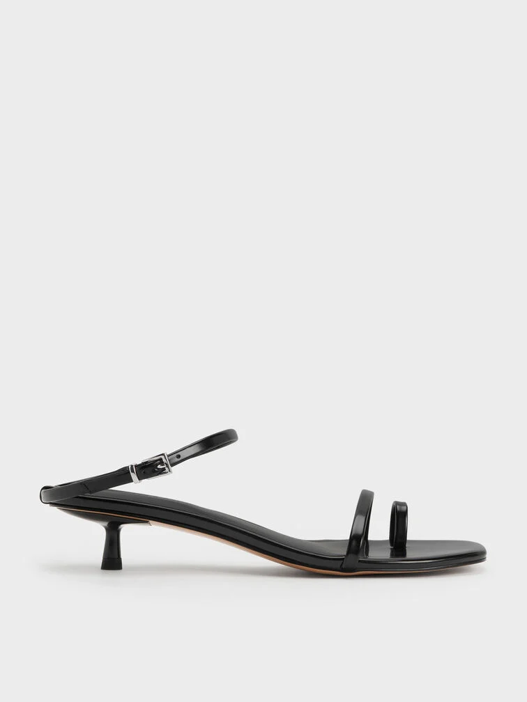 These Mariah sandals in black feature a strappy design, dainty kitten heels, toe-ring details, and neat square toes. Wear them with structured layers to build a weekday look that stands out while still looking put together.