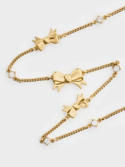 This Paige necklace in gold features dainty bows and sparkling crystals along its delicate chain, a lobster-clasp closure and a chain extender that allows you to wear it at different drop lengths. Let it bring whimsical sparkle and feminine refinement to your jewellery collection.