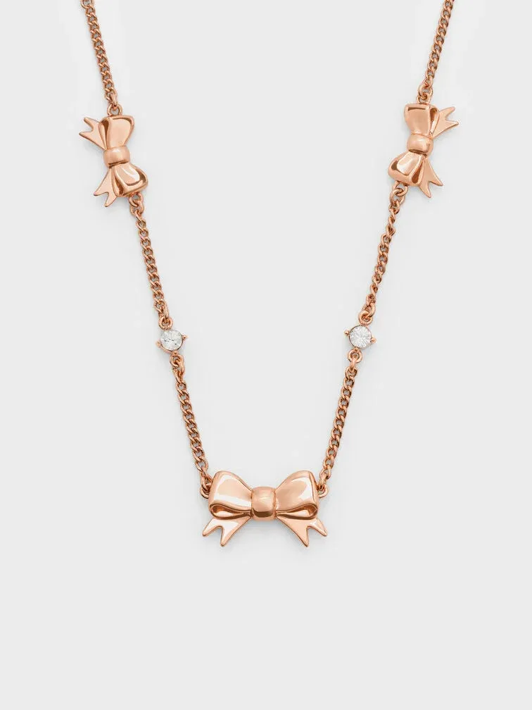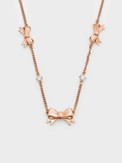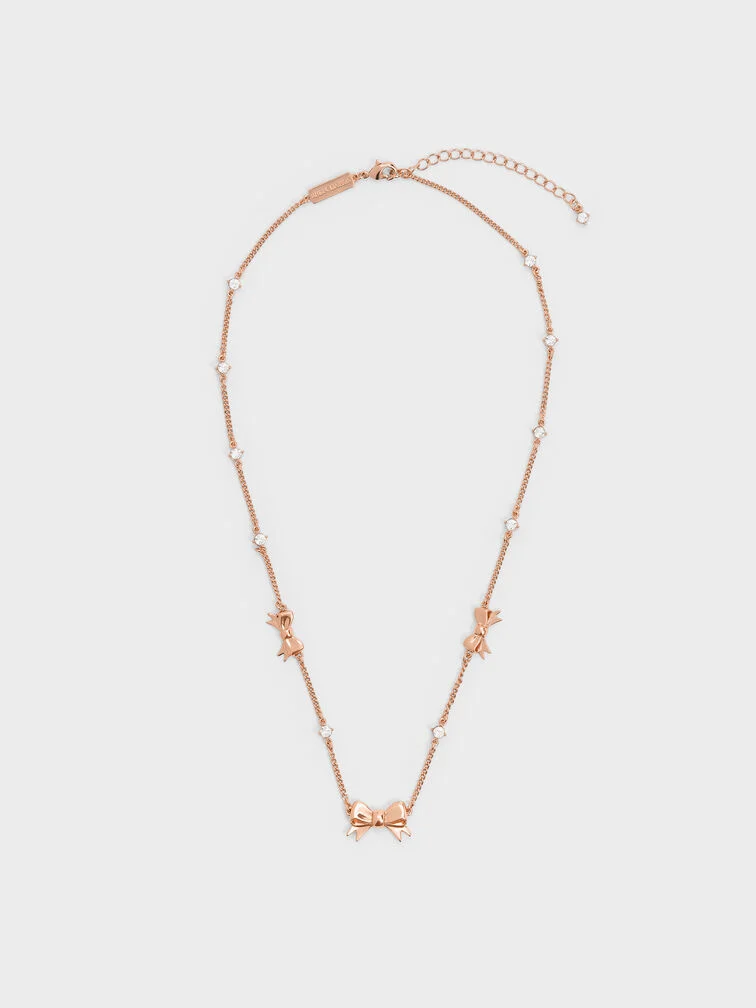 This Paige necklace in rose gold features dainty bows and sparkling crystals along its delicate chain, a lobster-clasp closure and a chain extender that allows you to wear it at different drop lengths. Delicate and charming, it is perfect for everyday wear.