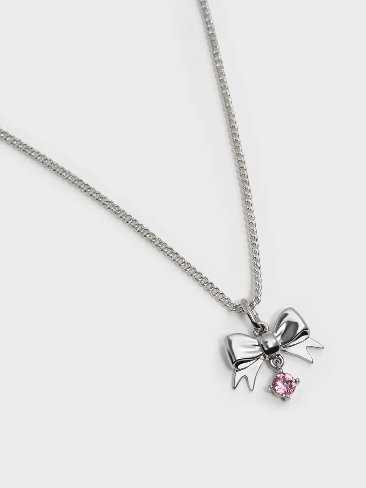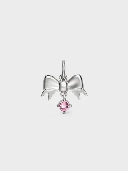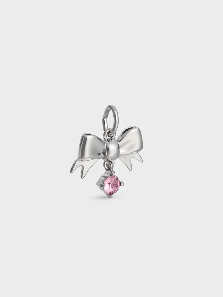 This Paige charm features a cool silver-tone finish and a dainty bow motif adorned with a pink hanging crystal. It is perfect for accessorising minimalist jewellery, adding a touch of feminine charm and personalisation to your collection.