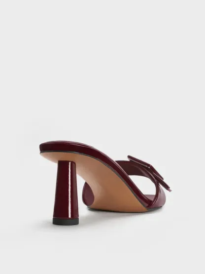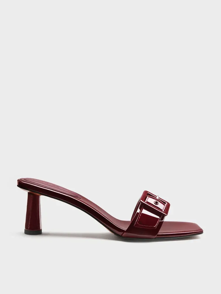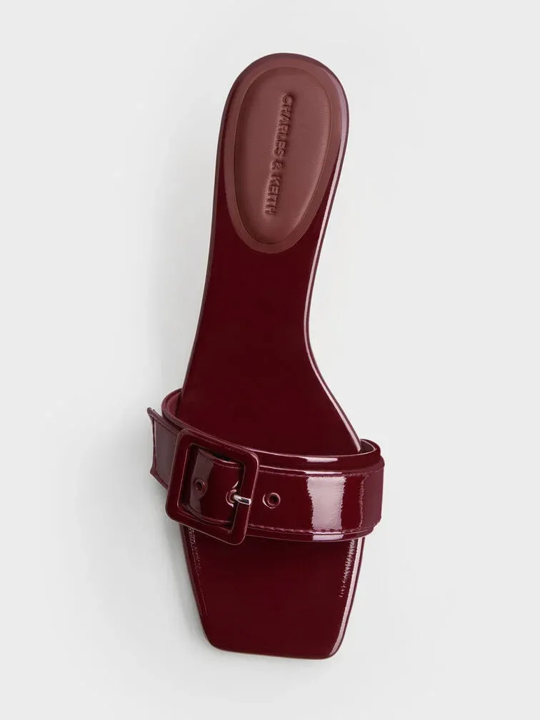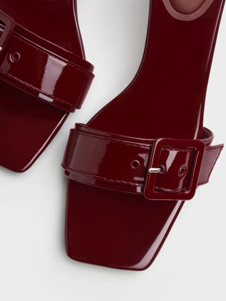 These mules in burgundy feature a patent finish, a minimalist design, sharp square toes, buckled straps, and striking cylindrical heels. Let them add a striking detail to your favourite go-to outfits so they look new and refreshed.