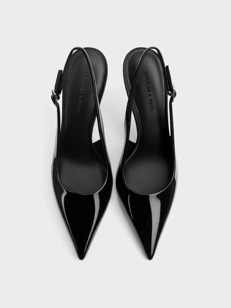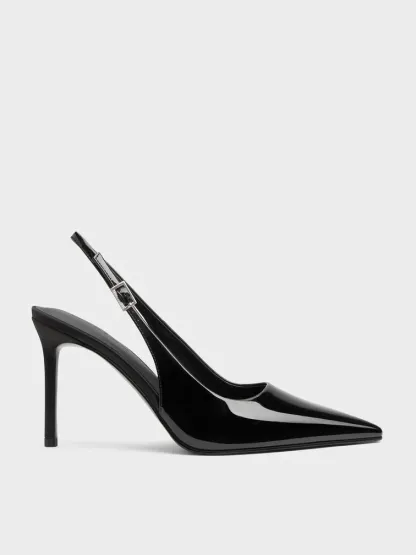These slingback pumps in black feature a patent finish, sleek pointed toes, elegant stiletto heels and slim buckled back straps. Wear them to add sophistication and subtle shine to your go-to weekday look.