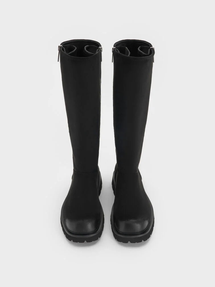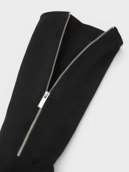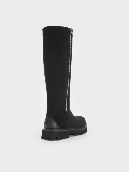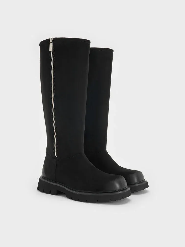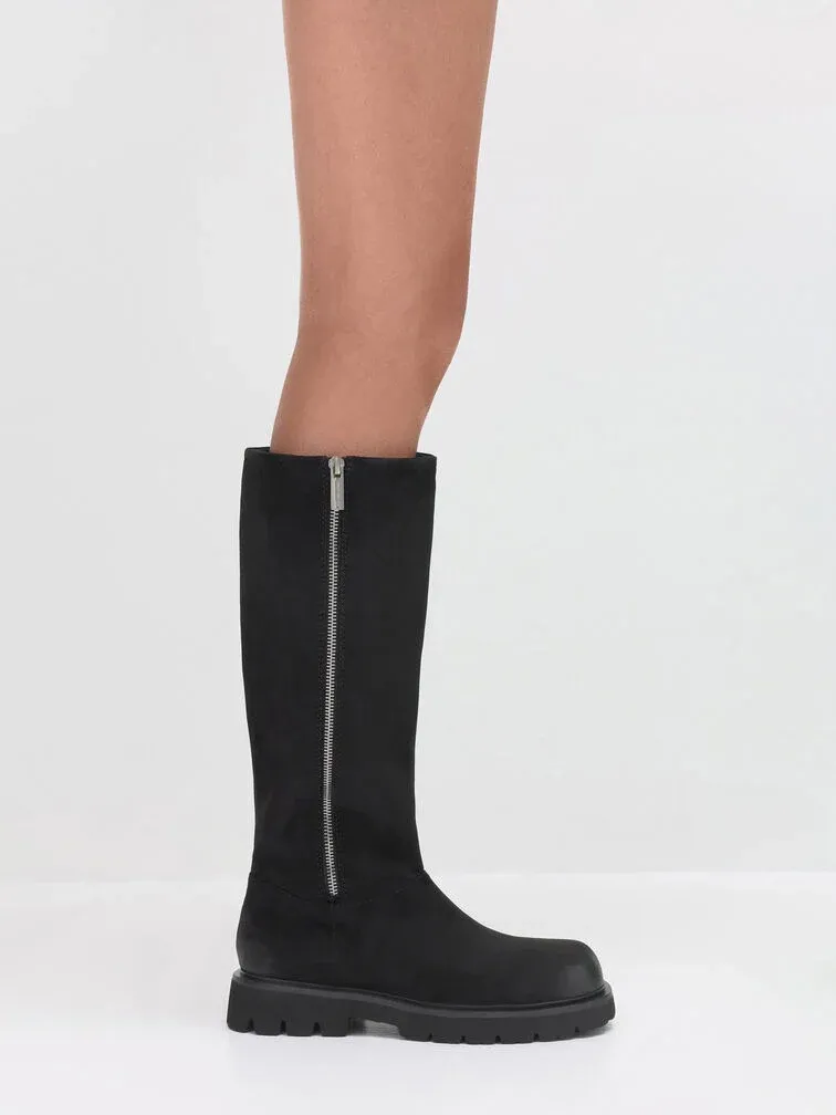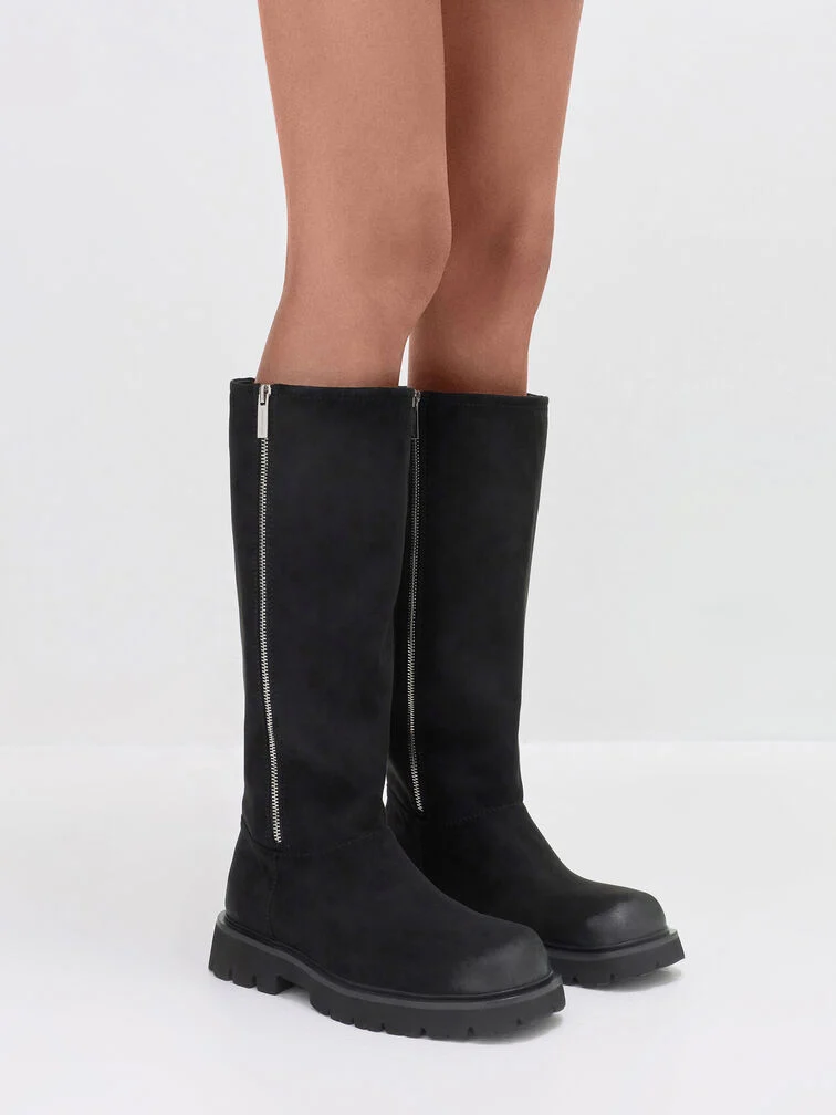 These Rosamond knee-high boots in black are made with faux suede and feature ridged soles, rounded toes and practical side zips. Pair them with soft woollen layers or relaxed denim pieces for cosy winter style.