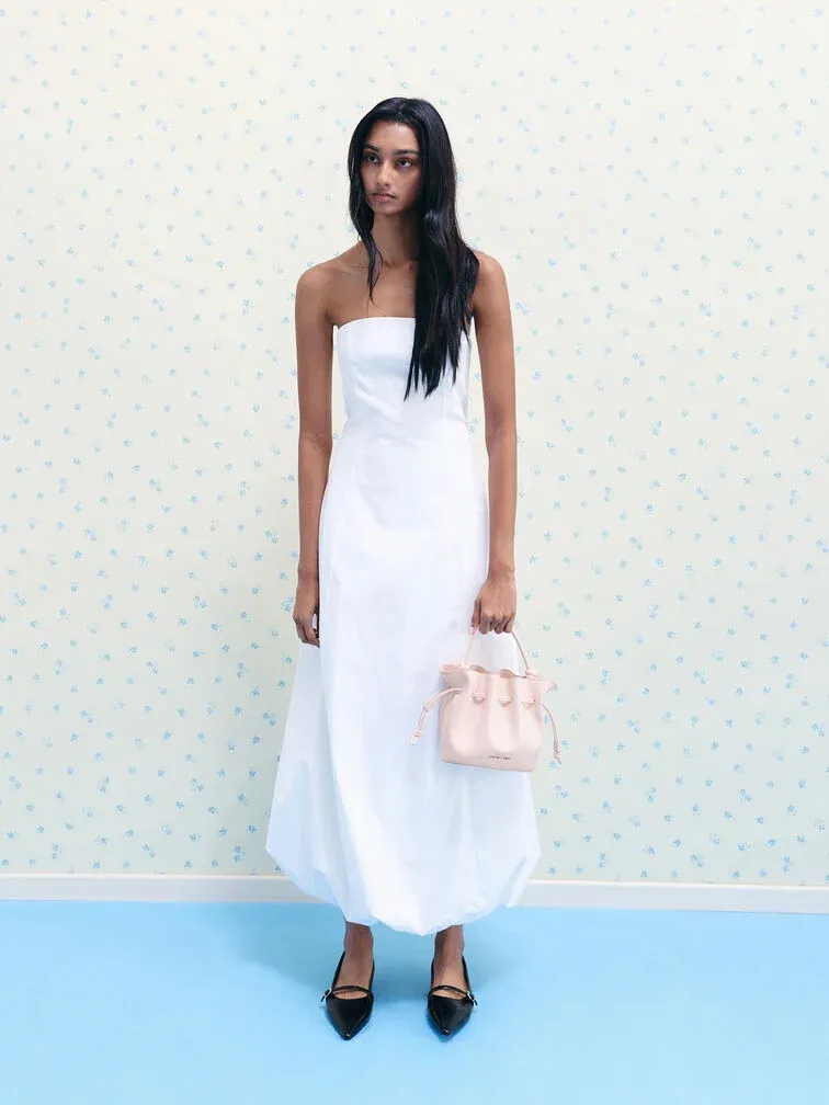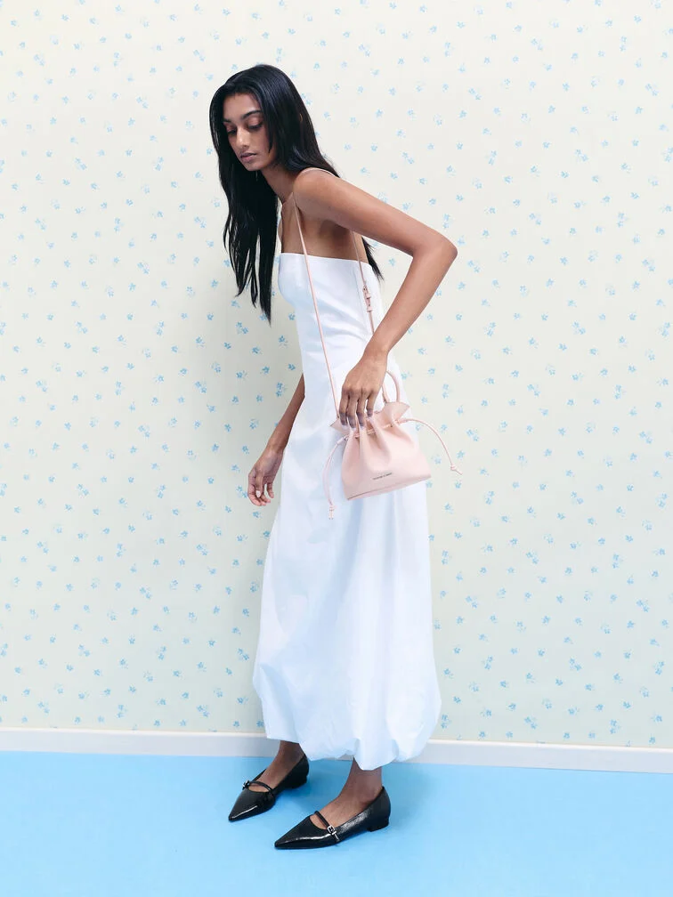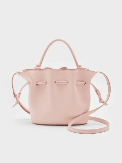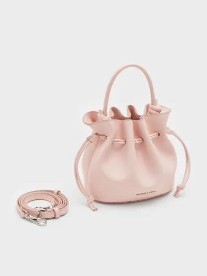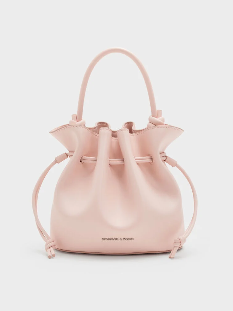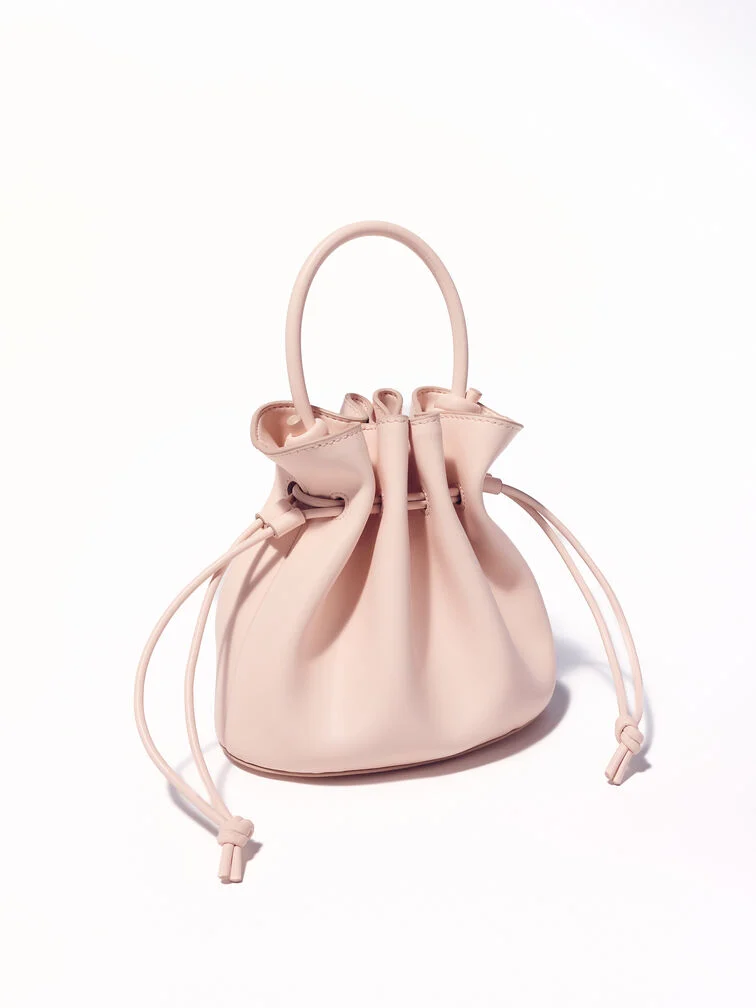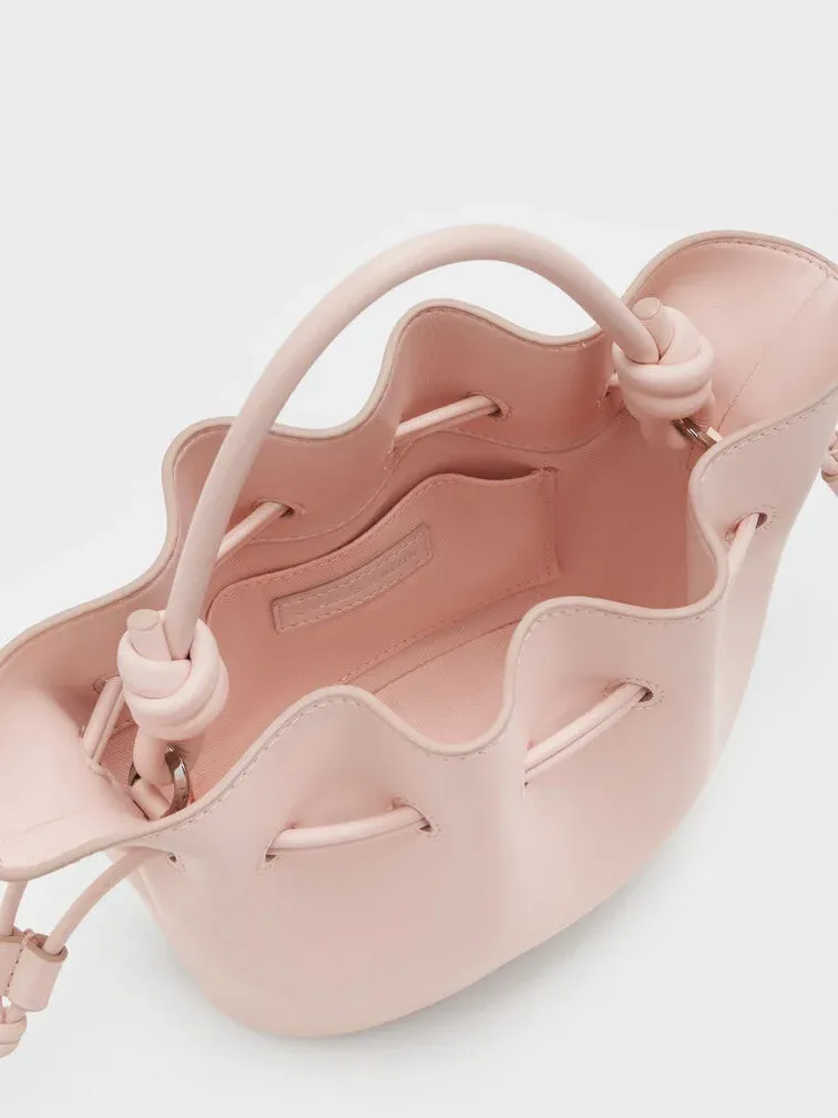 This Sammie bucket bag in soft pink features a knotted top handle, a drawstring closure, and sleek knotted dangling straps. Feminine and practical at the same time, it will pair well with a variety of outfits, from casual daytime looks to elegant evening ensembles.