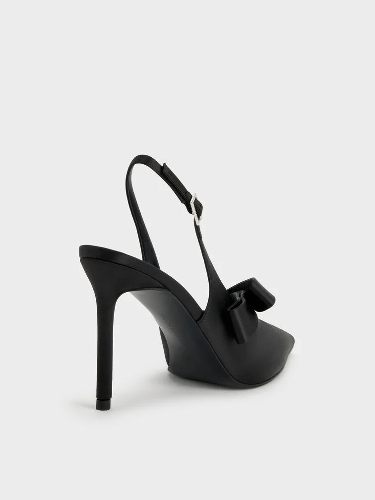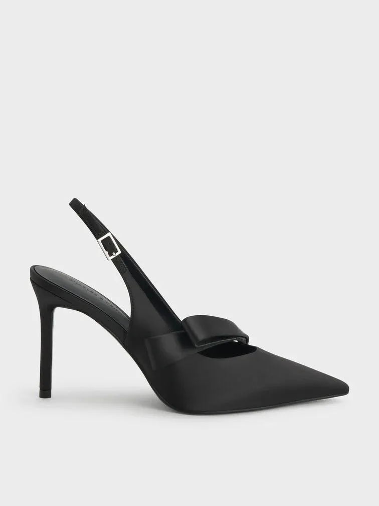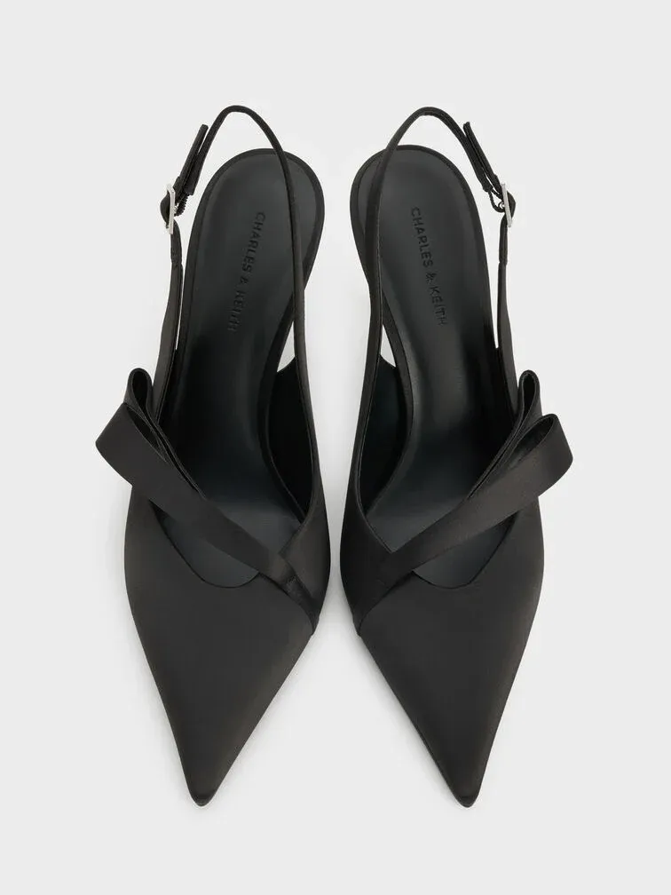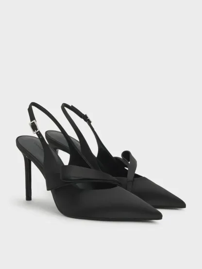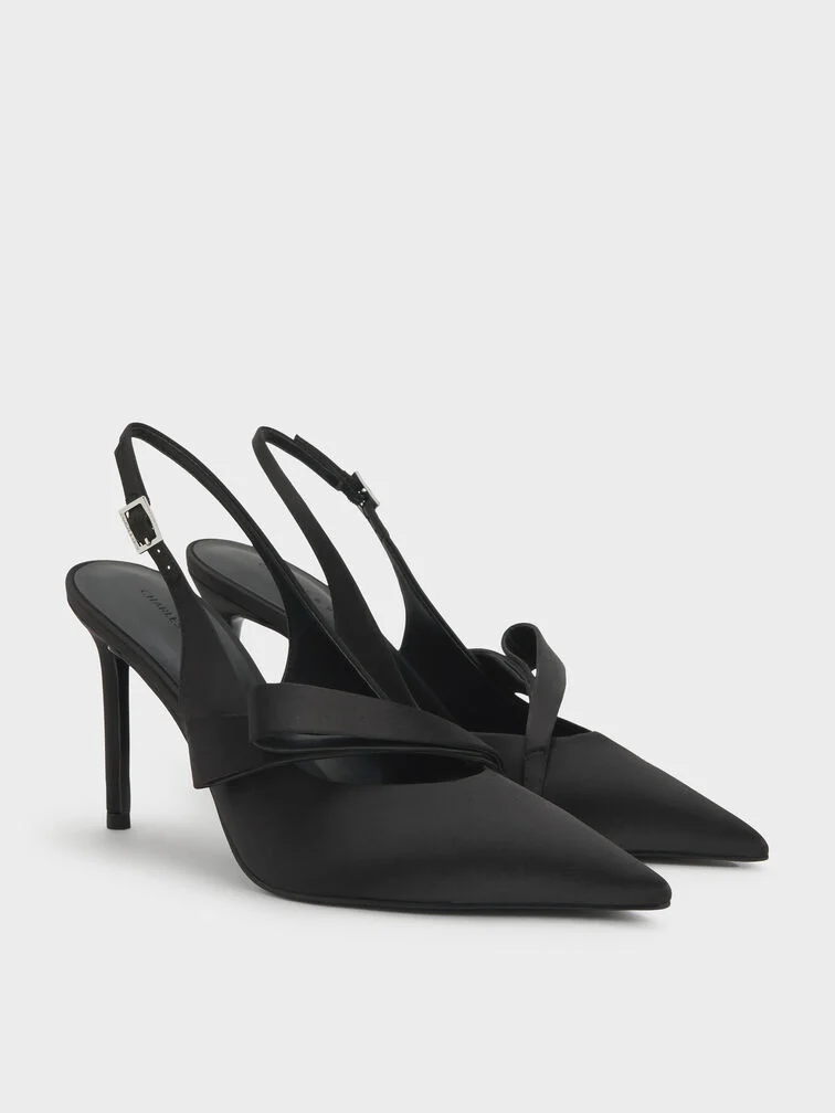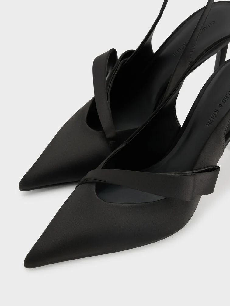 These slingback pumps in black are made with satin and feature an asymmetrical pleated-strap design, pointed toes, stiletto heels and adjustable buckled slingback straps. Wear them to exude quiet confidence in the office and other professional settings.
