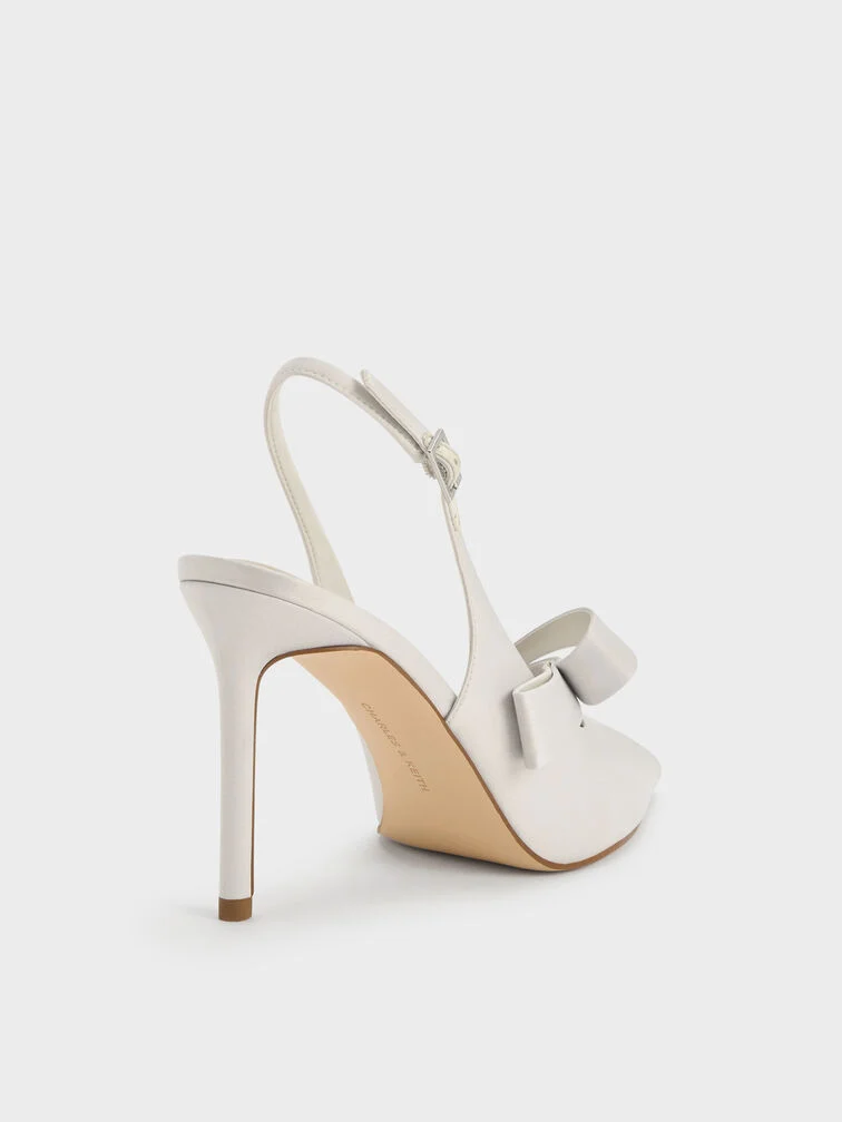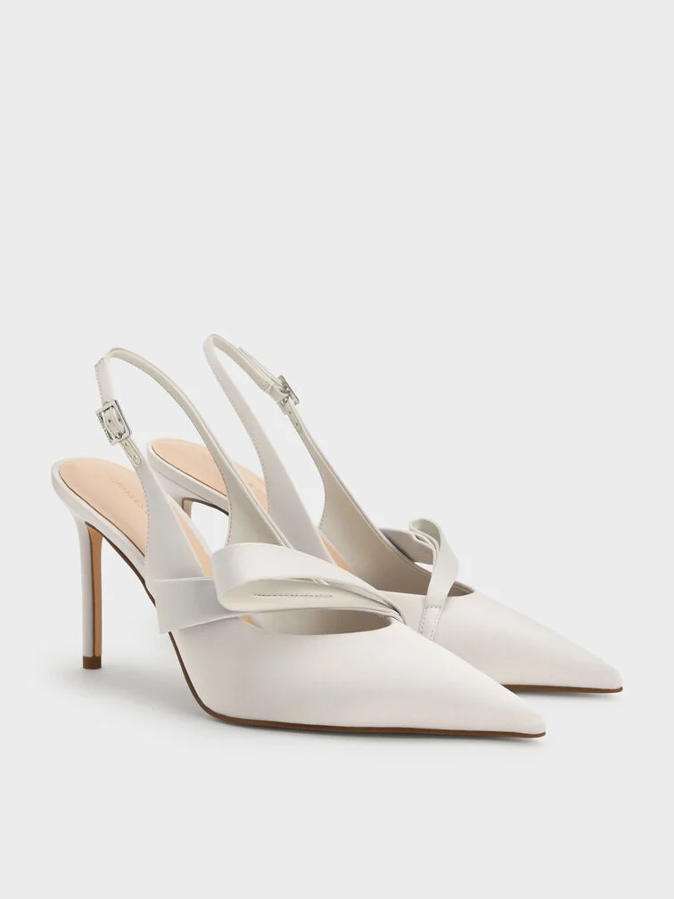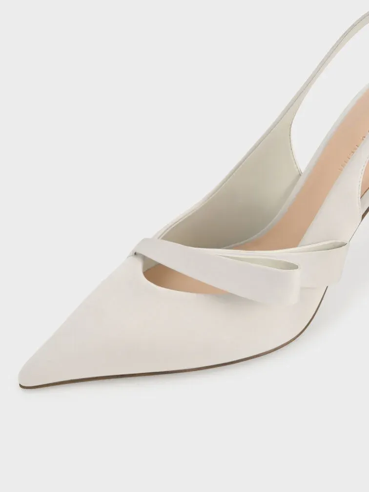 These slingback pumps in light grey are made with satin and feature an asymmetrical pleated-strap design, pointed toes, stiletto heels and adjustable buckled slingback straps. Let them bring stylish definition to relaxed jersey pieces and denim sets.