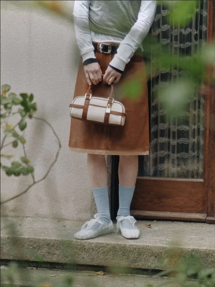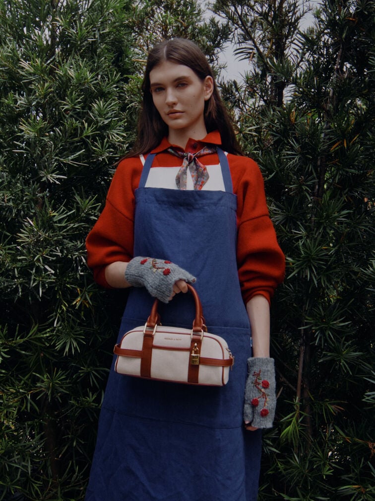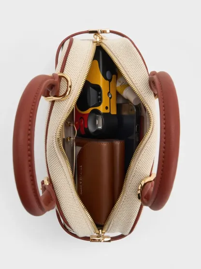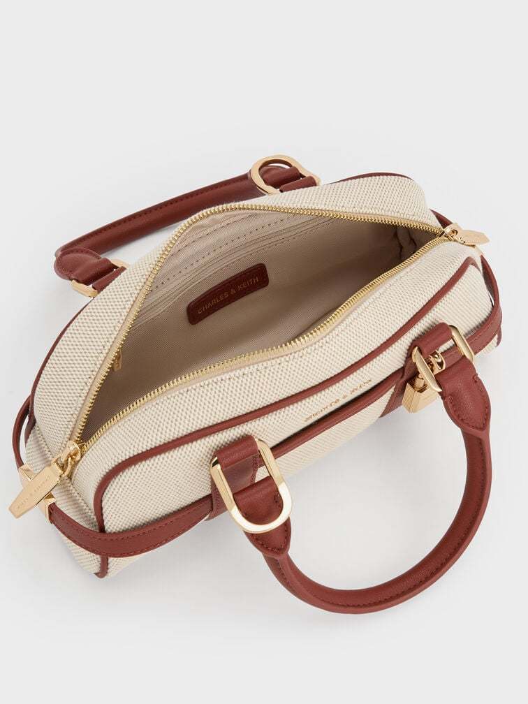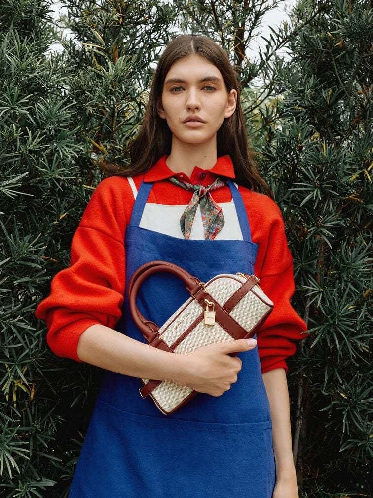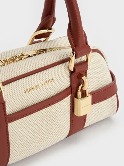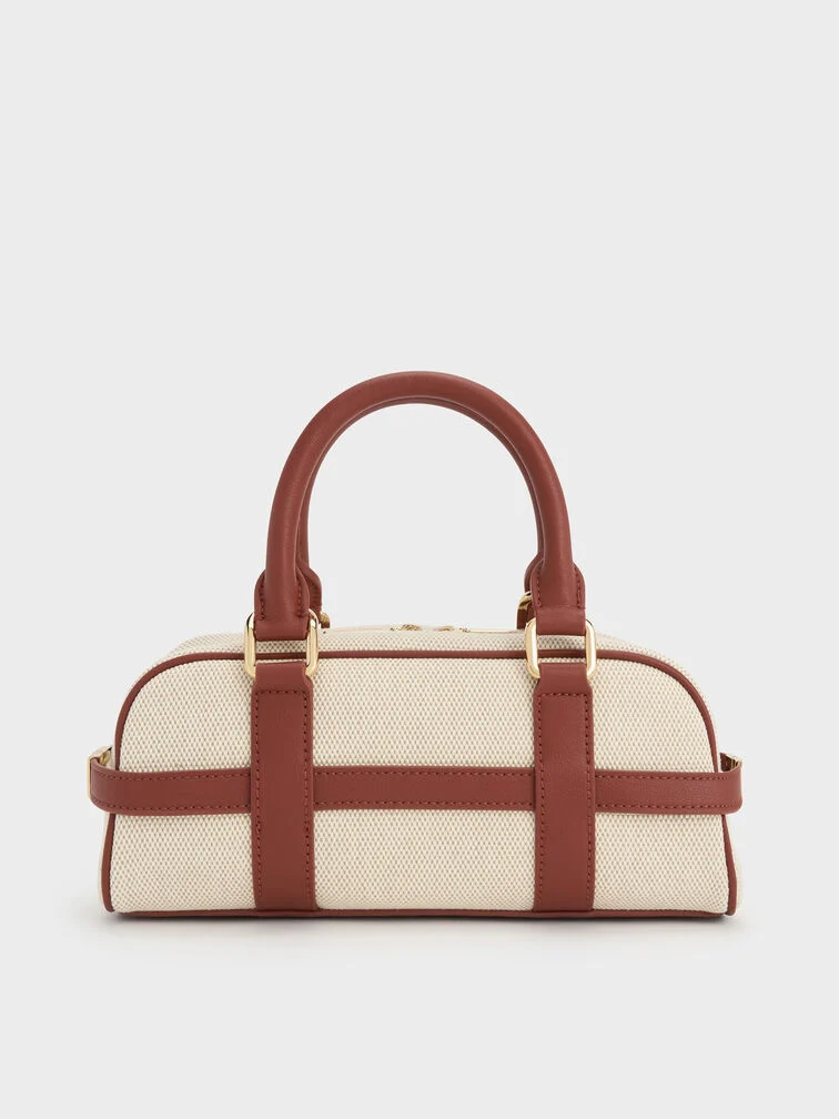 This Scottie bowling bag in brick is made with canvas and features a stylish east-west structure, buckled side straps, a shiny gold-tone lock charm, short double handles, a zip closure and a roomy interior. It will elevate comfortable all-day outfits with their striking silhouette and eye-catching details.