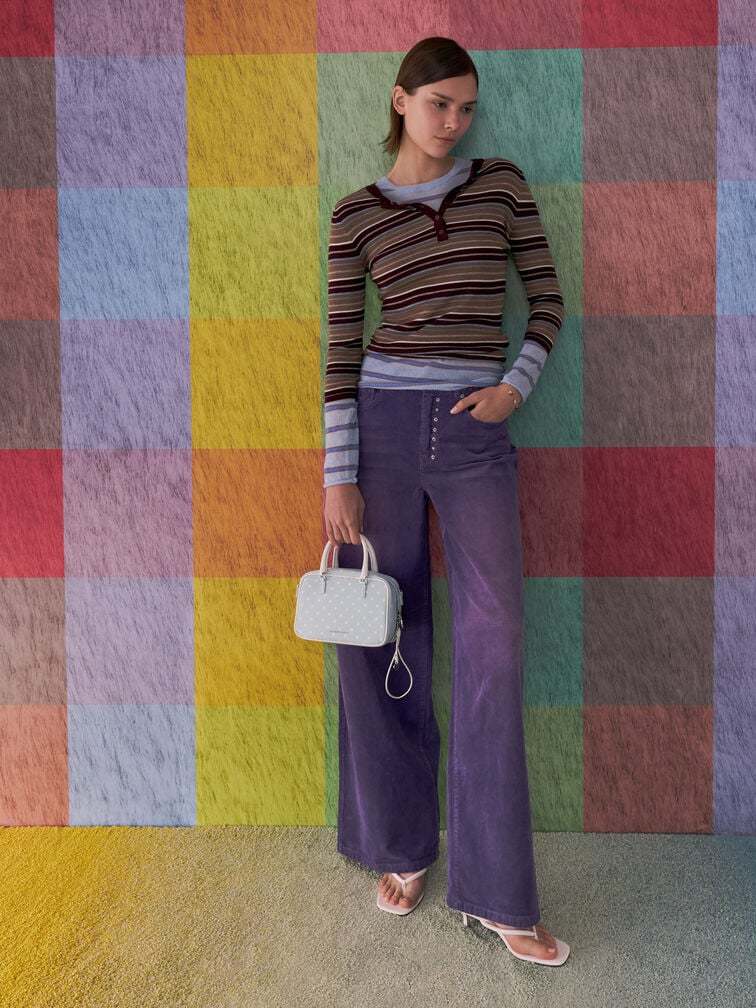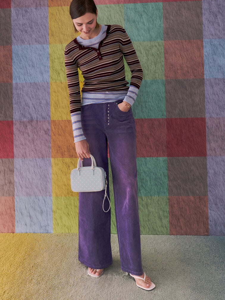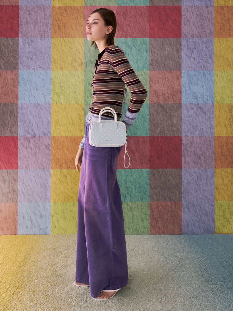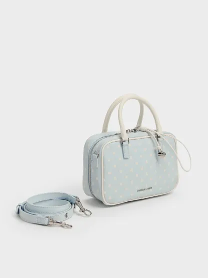 This Sianna bowling bag in sea salt blue features a rounded boxy silhouette, a polka-dotted finish, contrasting double handles, a double-zip closure and a detachable shoulder strap. Carry it to brighten weekend looks with stylish structure and playful details.