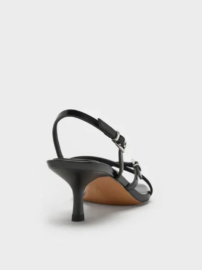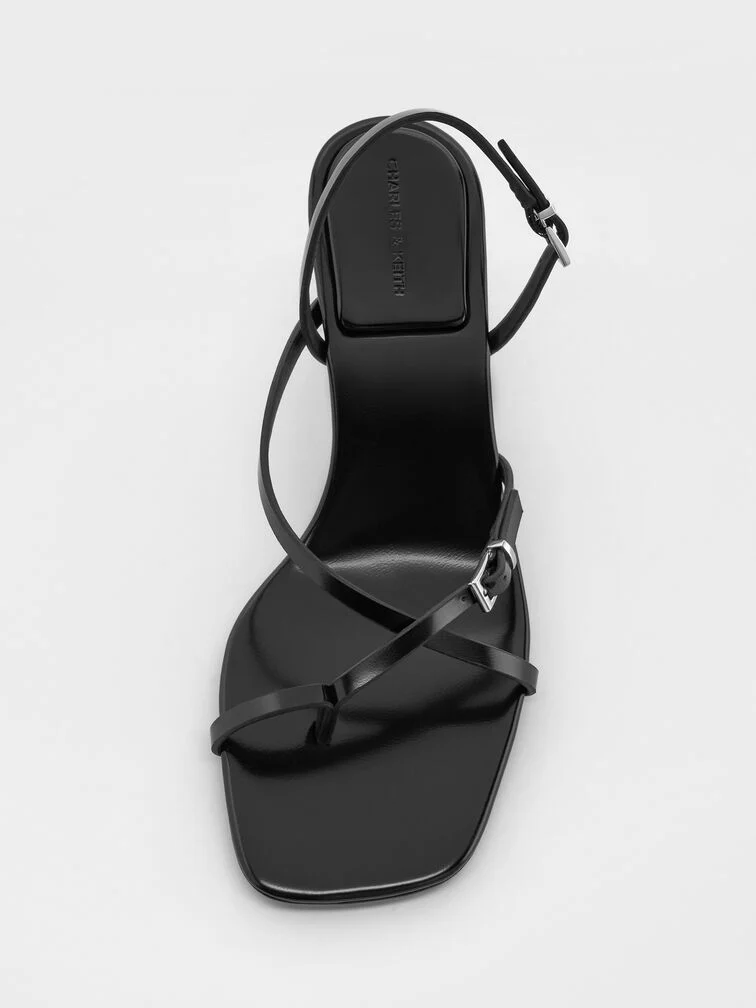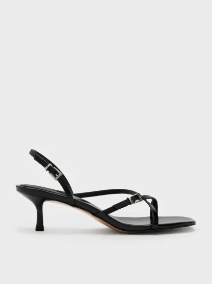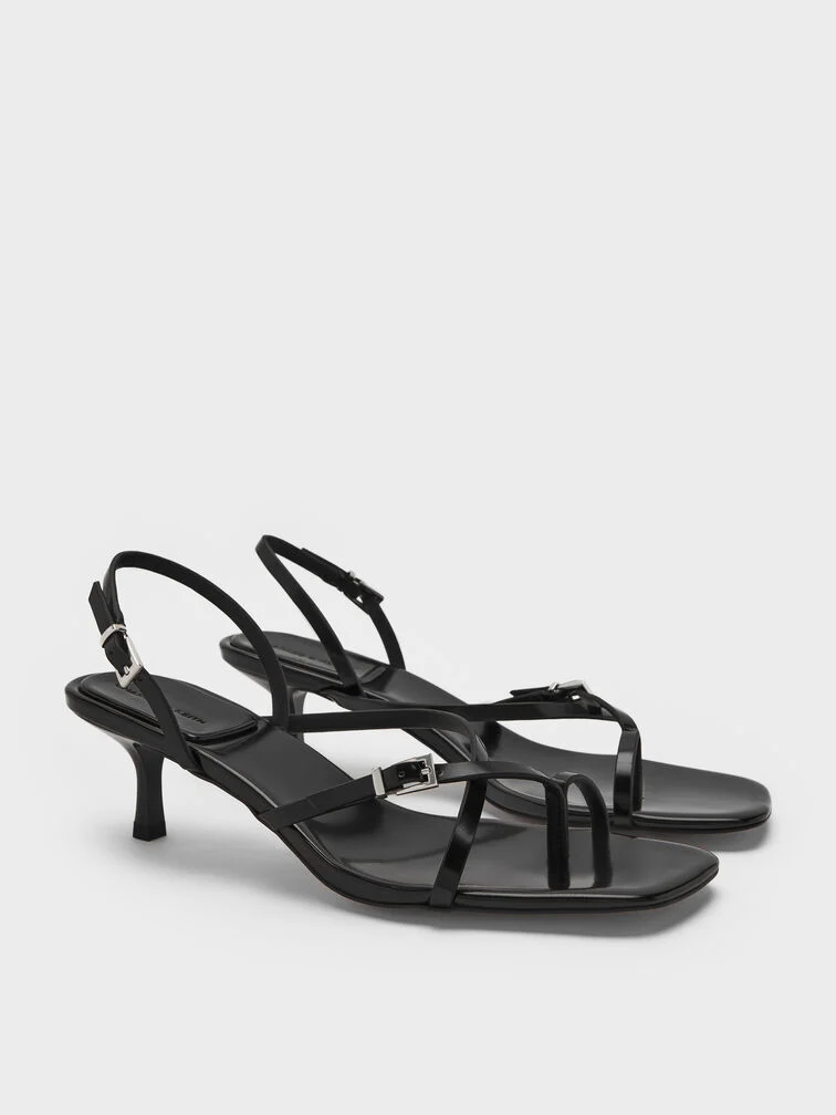 These slingback thong sandals in black feature slender crossover straps, polished buckle, dainty kitten heels, and neat square toes. Use them to anchor your Monday-to-Friday edits with modern elegance and ease.