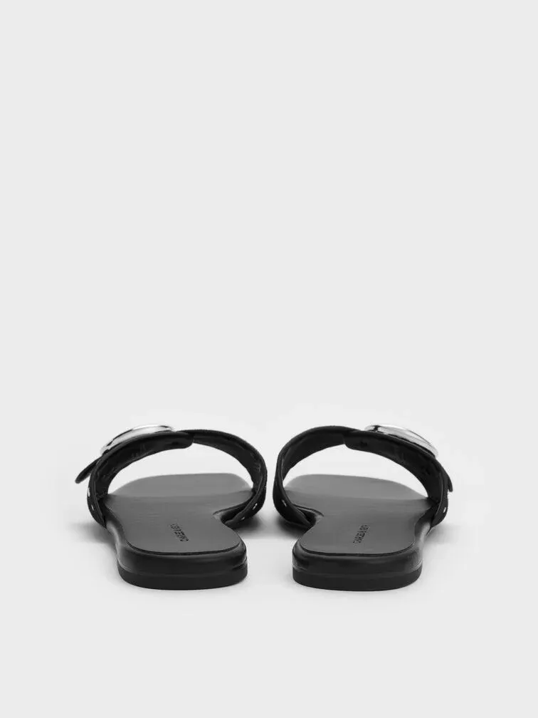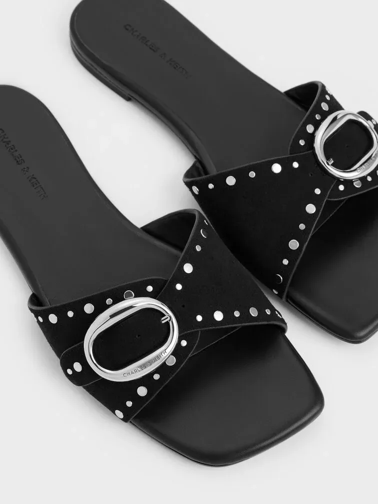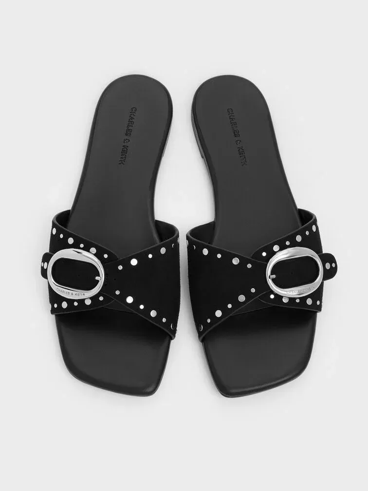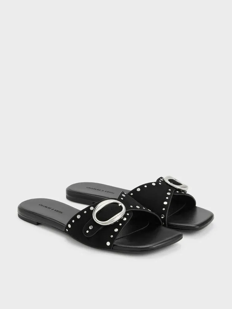These slide sandals in black are made with faux nuback leather and feature a buckled single-strap design embellished with gold studs, open square toes and flat soles. Use them to complete your casual, off-duty edits with flair.