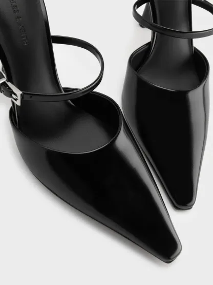 These mules in black feature a tapered square-toe design, thin buckled straps across the vamps, and distinctive flared stiletto heels. They will refine your weekday ensembles with their clean lines and sophisticated details.